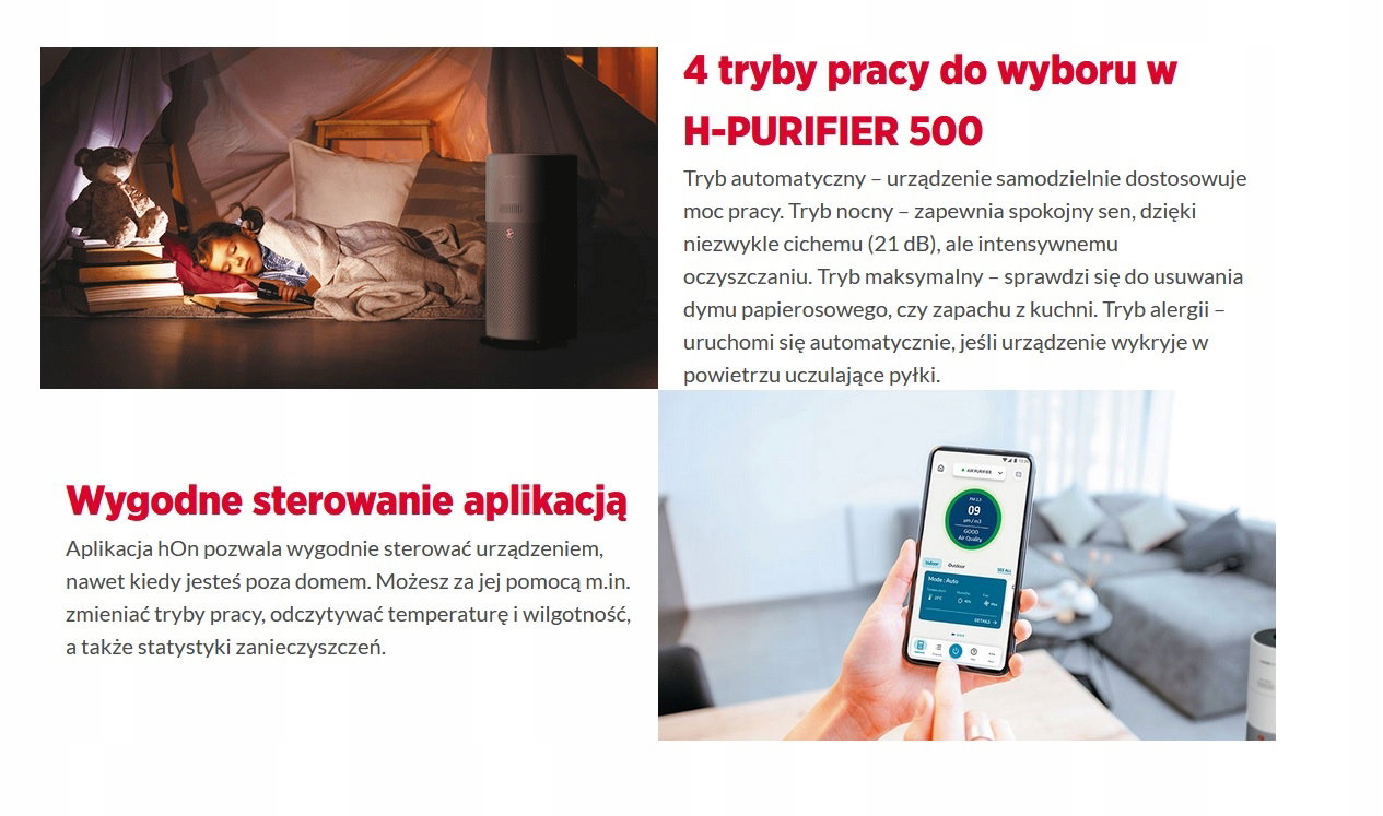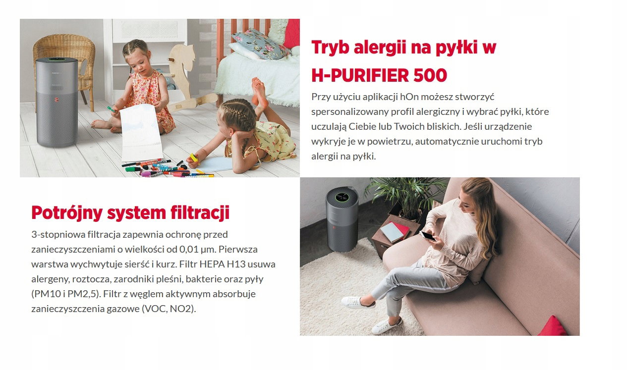 - Czy oczyszczacz powietrza pomaga przy alergiach?Tak. Oczyszczacz powietrza H-PURIFIER wychwytuje i neutralizuje pyłki, łagodząc reakcje alergiczne. Ponadto, aplikacja hOn umożliwia utworzenie profilu alergicznego użytkownika, w którym wybierasz pyłki, na które jesteś uczulony. Aplikacja na bieżąco monitoruje stężenie wybranych pyłków. Jeśli wykryje ich obecność, wyśle ostrzeżenie i aktywuje tryb alergii.