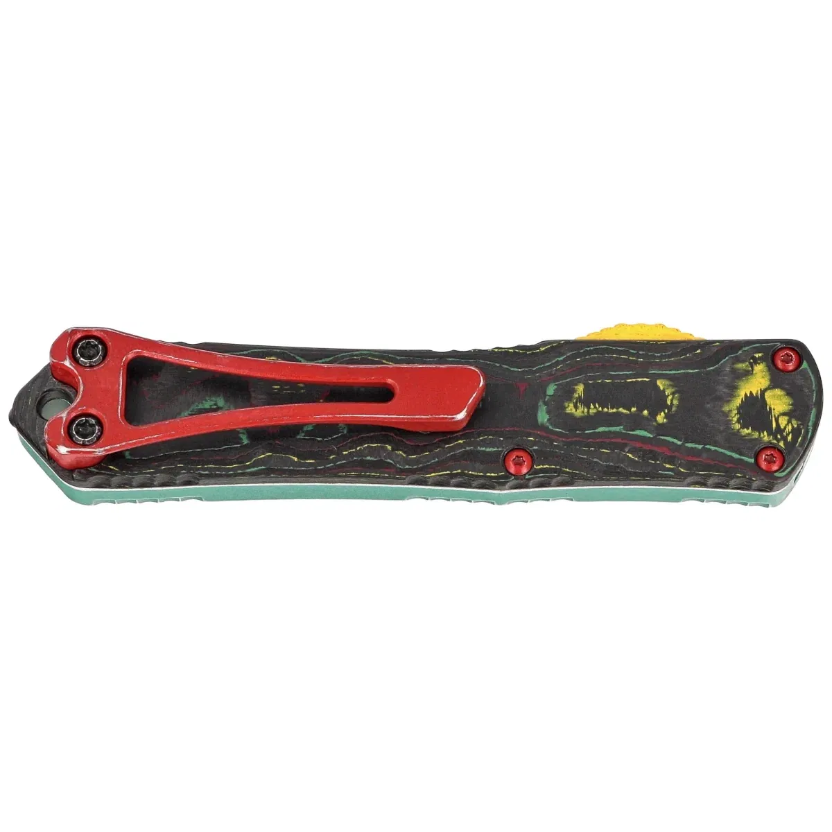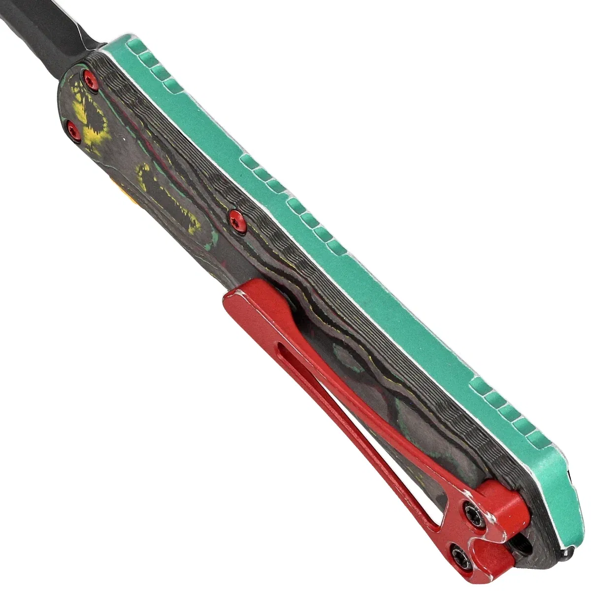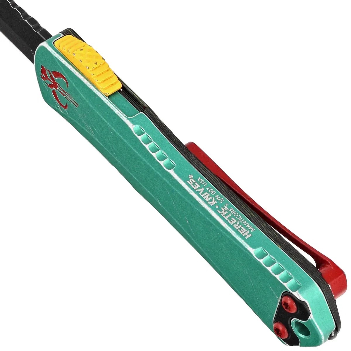 Rękojeść - wykonana po stronie prezentacyjnej z doskonałą precyzją w technologii 3D na frezarkach CNC, z anodyzowanego na zielono aluminium 6061-T6. Po stronie klipsa Camo Carbon. Faktura powierzchni rękojeści powoduje, że nóż nie ślizga się w dłoni podczas używania. Symbol czaszki Mythosaura głęboko grawerowany i barwiony na czerwono, w tym samym kolorze klips i hardware noża. Wszystko wykończone metodą Battleworn. Na grzbiecie i dole rękojeści znajdują się nacięcia (jimping) dla pewniejszego chwytu. Smukły profil oraz frezowany dwupozycyjny (prawa/lewa) masywny klips typu deep carry, umożliwiają dyskretne przenoszenie noża w kieszeni, w pozycji tip-down (czubkiem ostrza do dołu). Rękojeść zakończono lanyard hole, otworem na linkę i zbijakiem do bicia szyb.