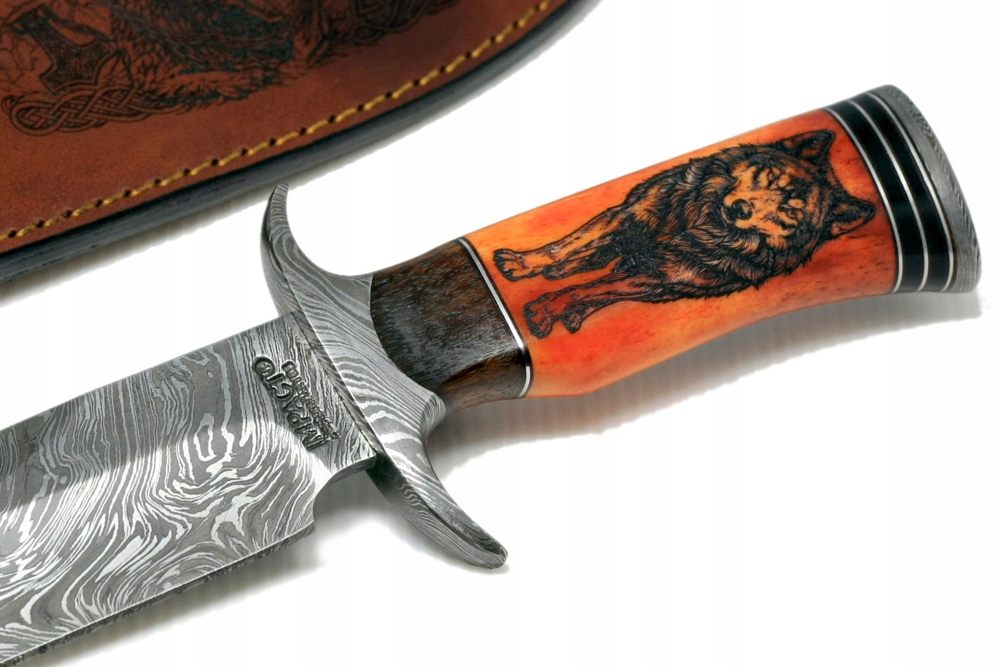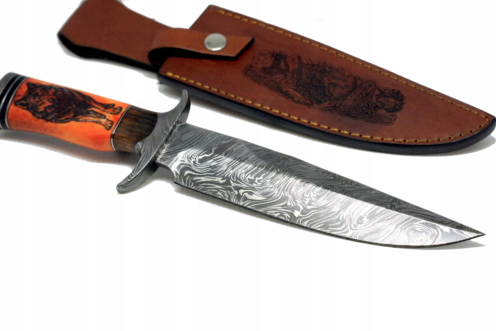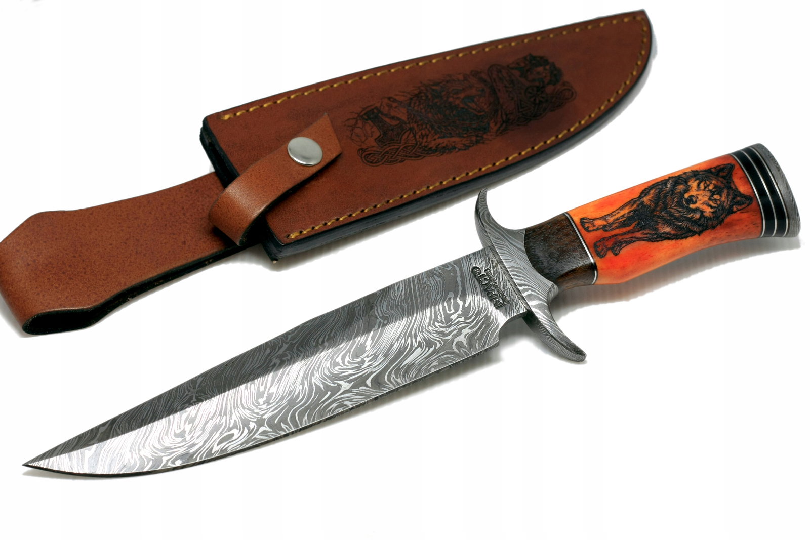 Nóż myśliwski BOWIE ręcznie wykonany stal DAMASCEŃSKA kość wielbłąda WILK