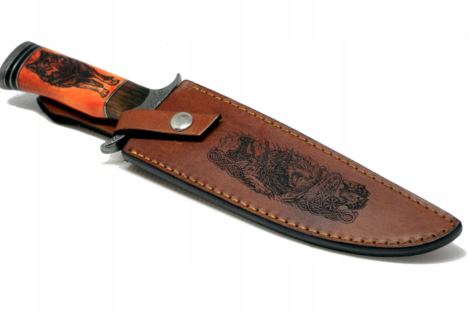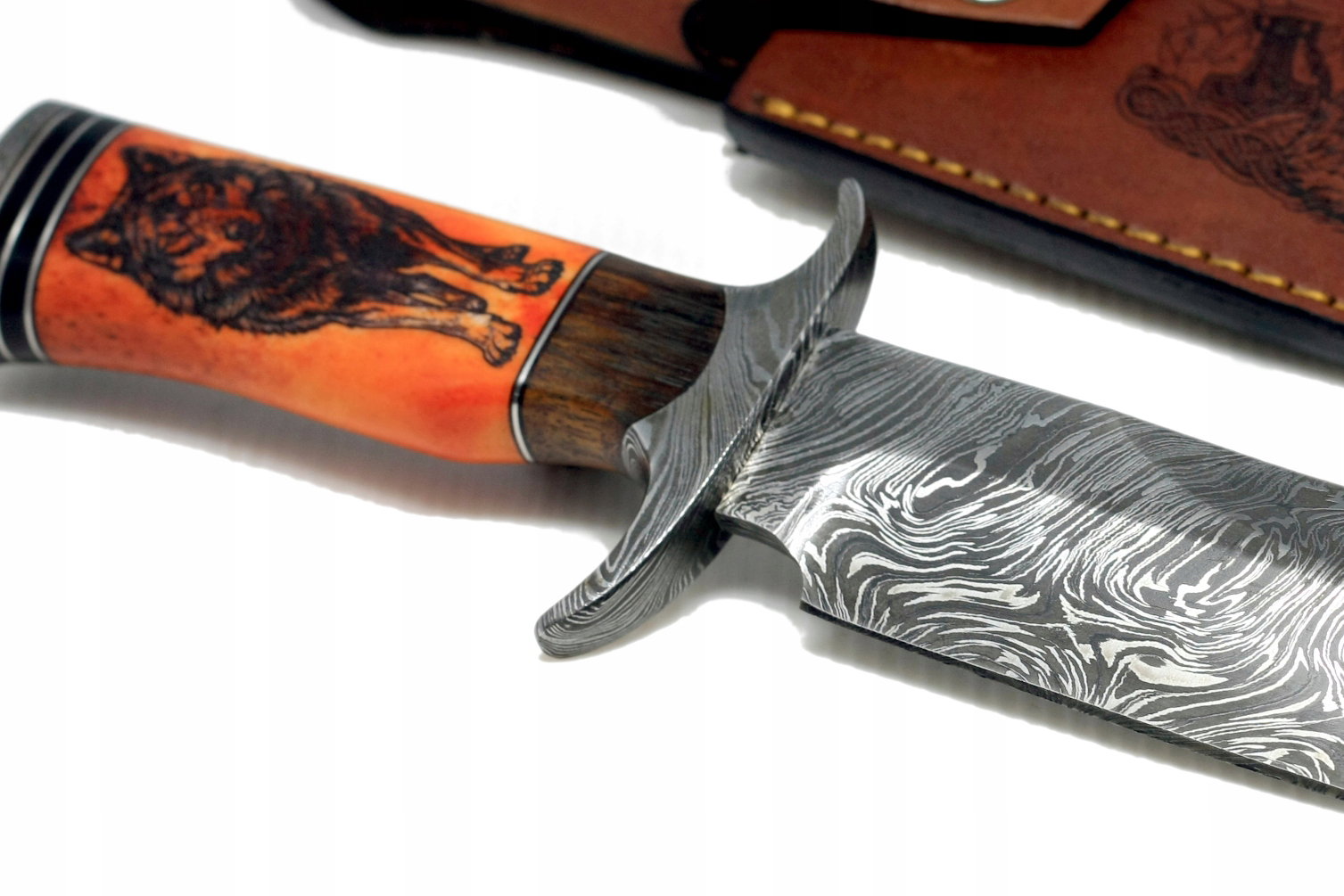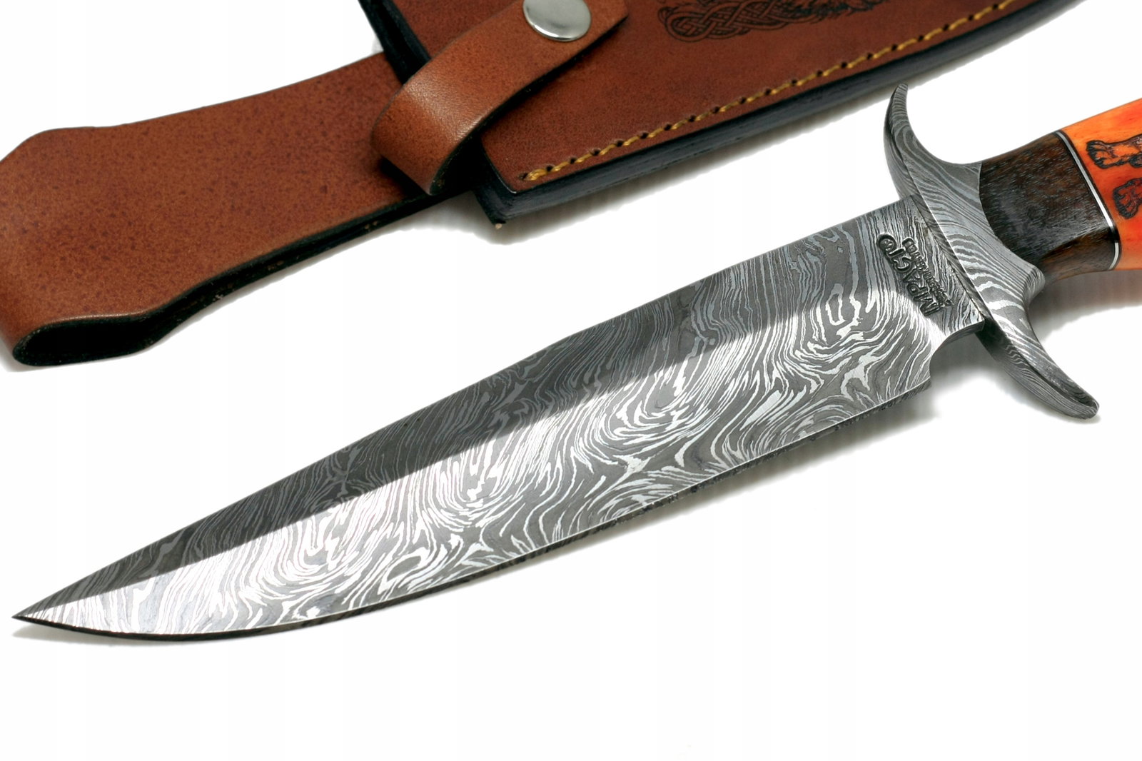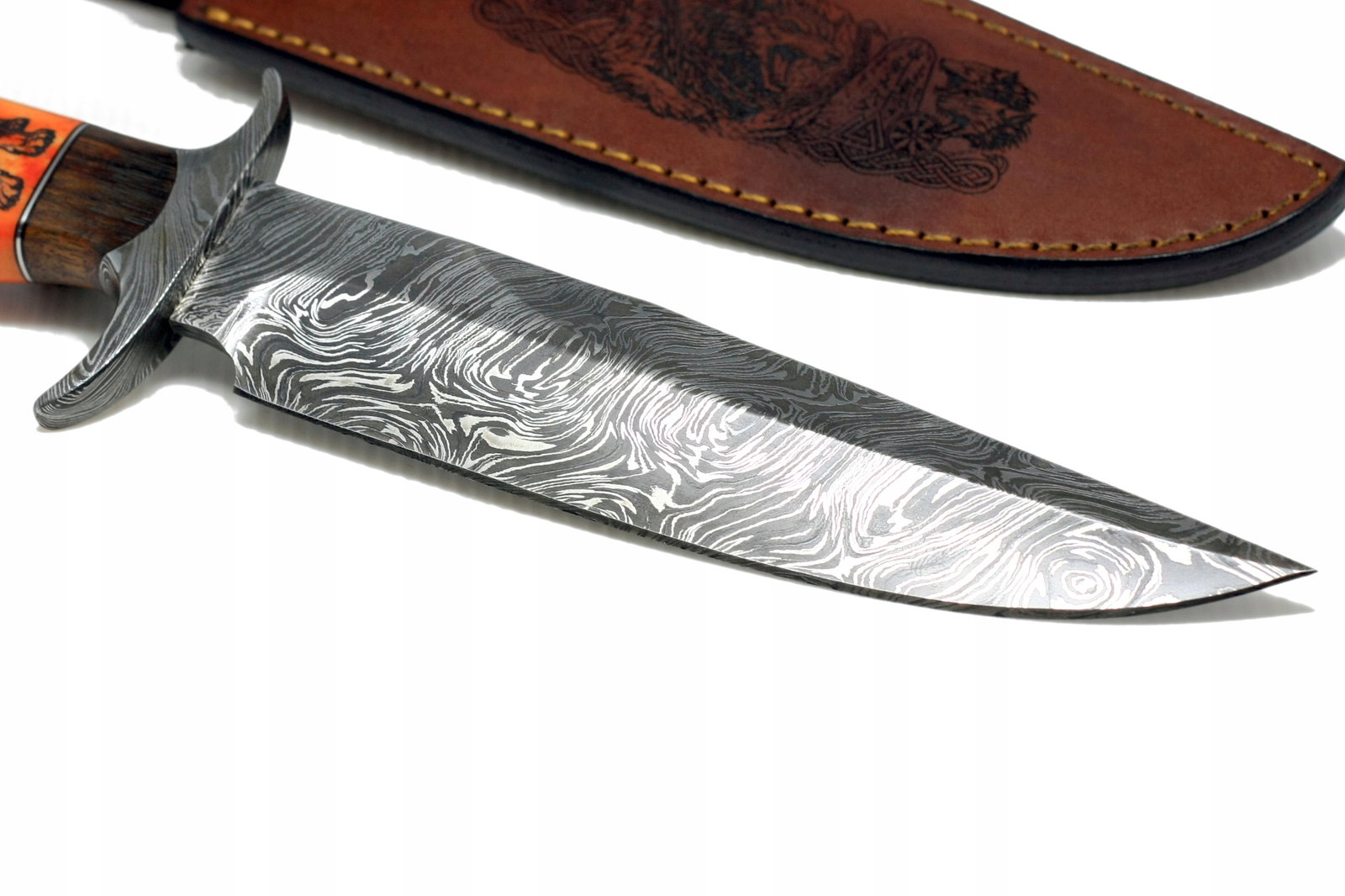Nóż myśliwski BOWIE ręcznie wykonany stal DAMASCEŃSKA kość wielbłąda WILK