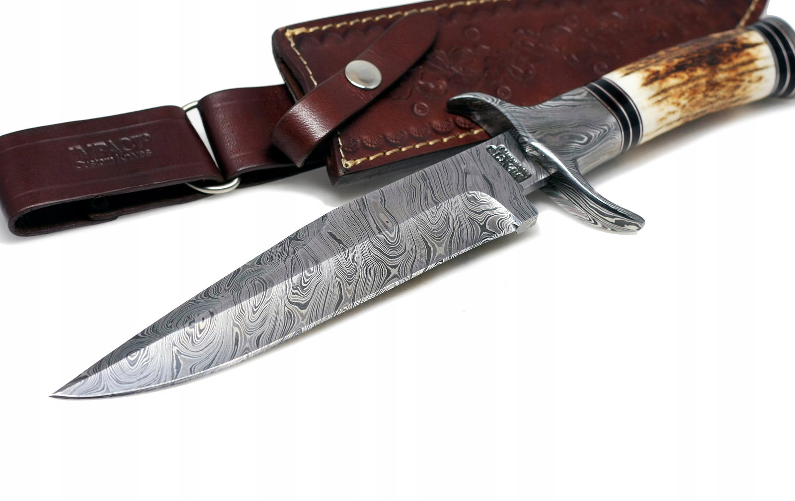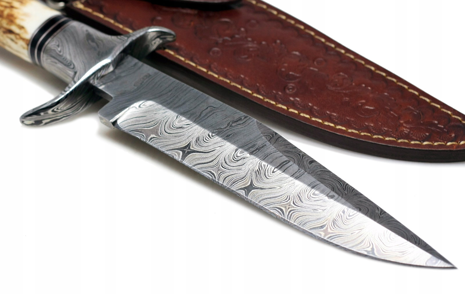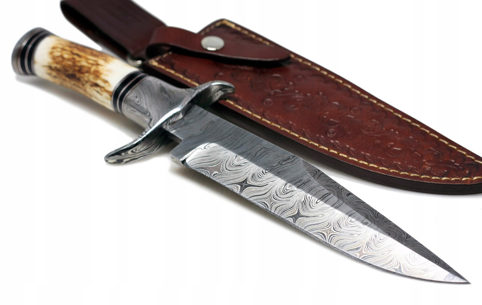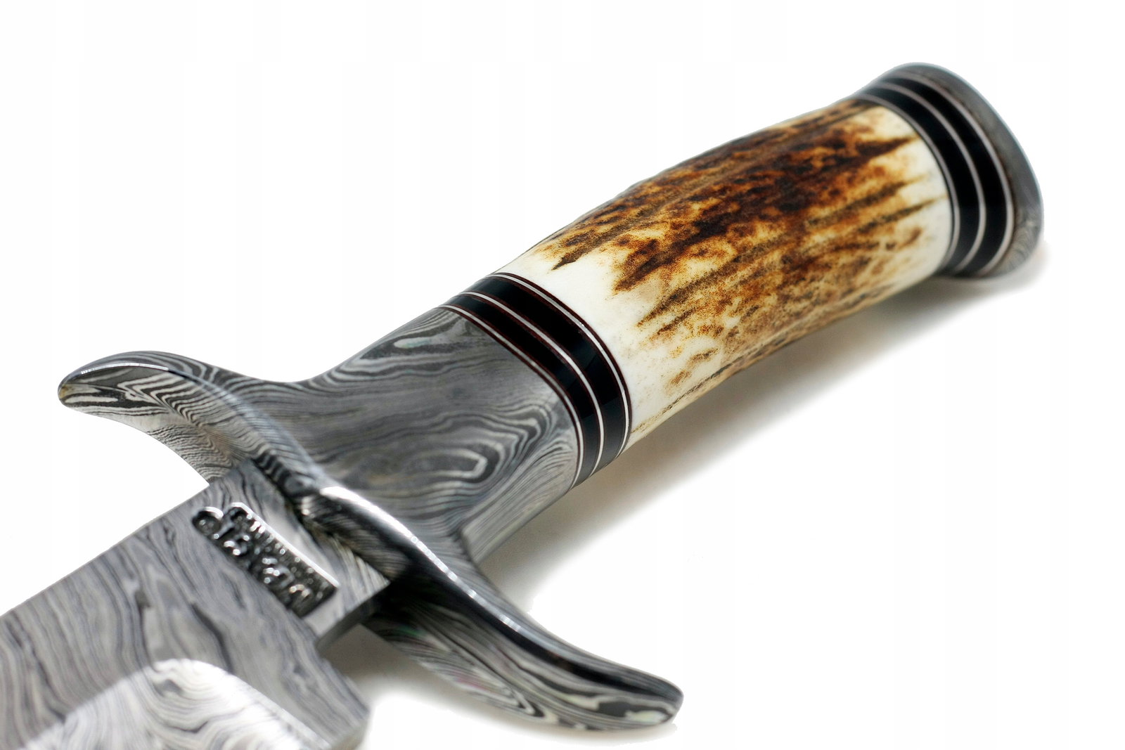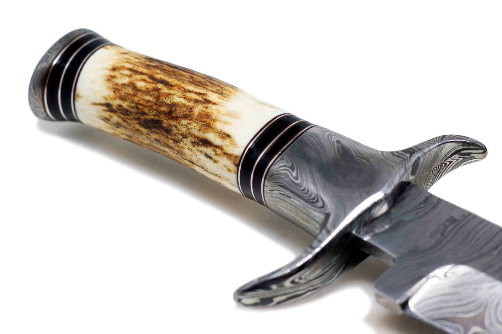Ostrze zostało poddane doskonałej obróbce cieplnej dzięki czemu bardzo dobrze trzyma krawędź / ostrość. Głownia ma fantastyczne ręczne szlifowanie po obu stronach, z góry znajduje się tzw. fałszywa krawędź. Twardy jak skała i wspaniała rękojeść wykonana z POROŻA JELENIA sprawia iż nóż świetnie trzyma się w dłoni. Jelec wykonano ze stali damasceńskiej