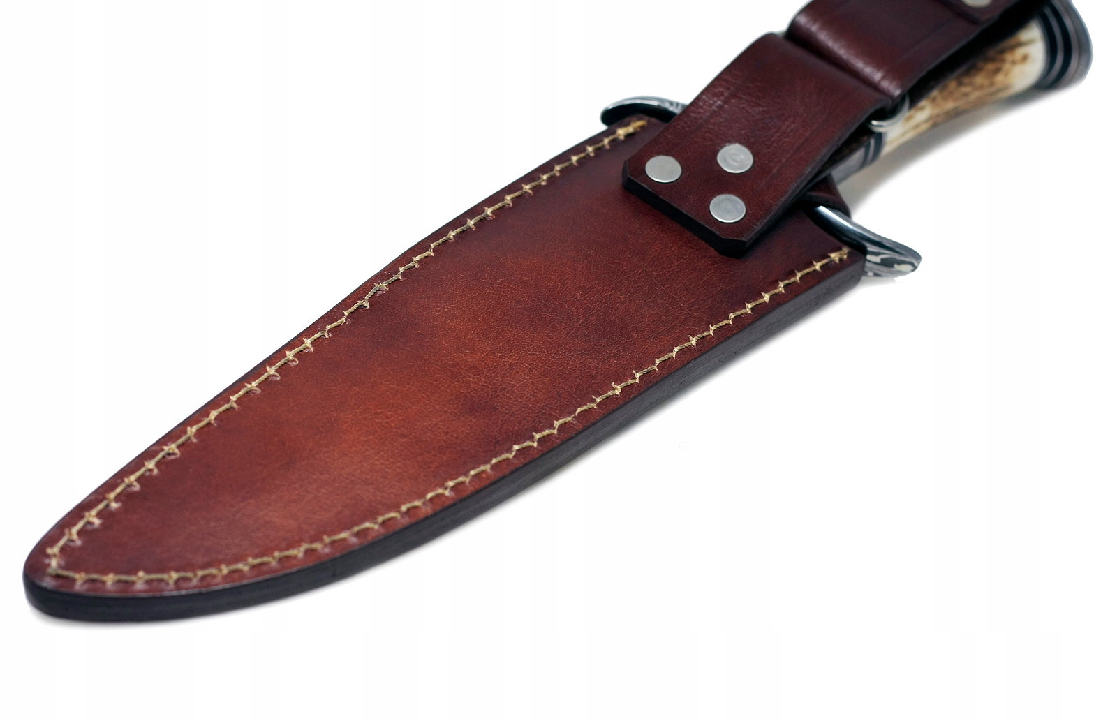 Ten nóż jest wyposażony w najwyższej jakości bardzo grubą w całości ręcznie szytą skórzaną pochwę. Bardzo gruba skóra cielęca i mocne przeszycia sprawiają, że ta osłona jest wytrzymała, przez co wytrzymuje długie lata trudnego i intensywnego użytkowania. Pochwę można nosić na pasku.