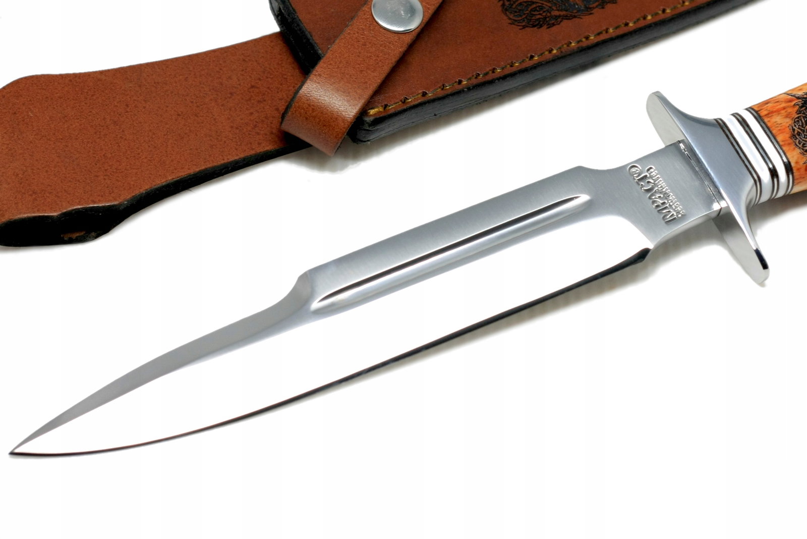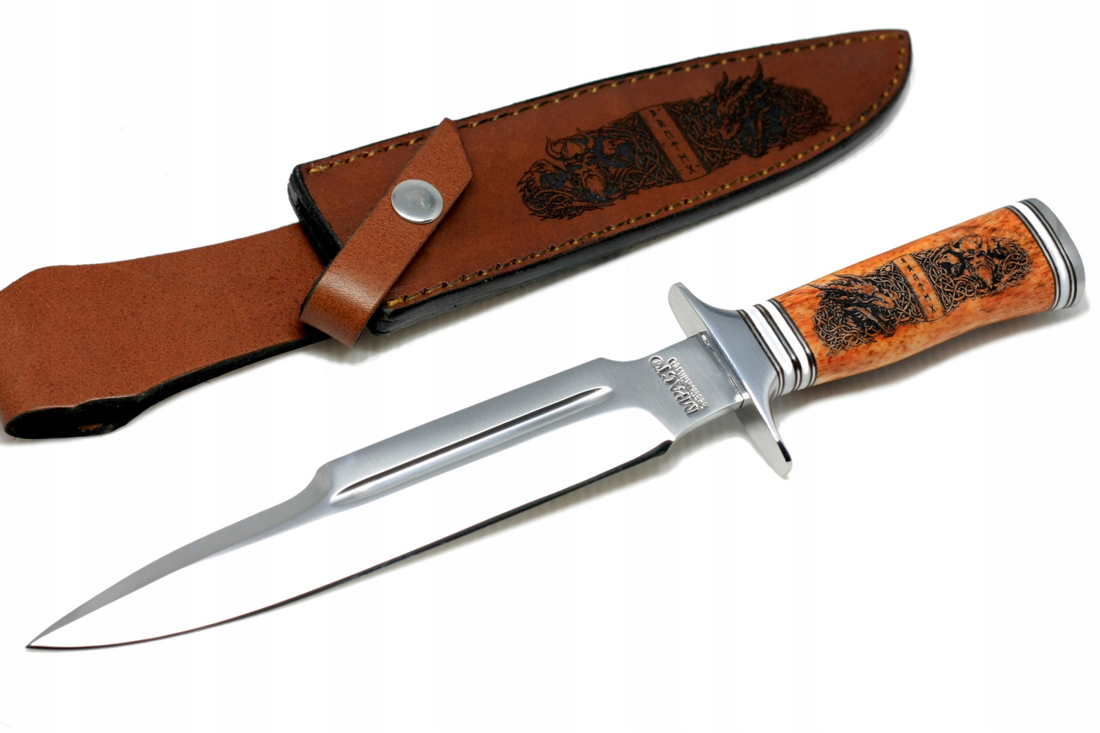 Ręcznie wykonany nóż typu BOWIE. Ostrze wykonane z wysokiej jakości stali D2 dzięki czemu utrzymuje swoje właściwości tnące przez długi czas bez konieczności ostrzenia, idealnie nadaje się na zewnątrz - polowanie, ryby, camping. Rękojeść opleciona drutem ozdobnym. Pokrowiec z naturalnej skóry cielęcej zapewnia idealną ochronę ostrza.