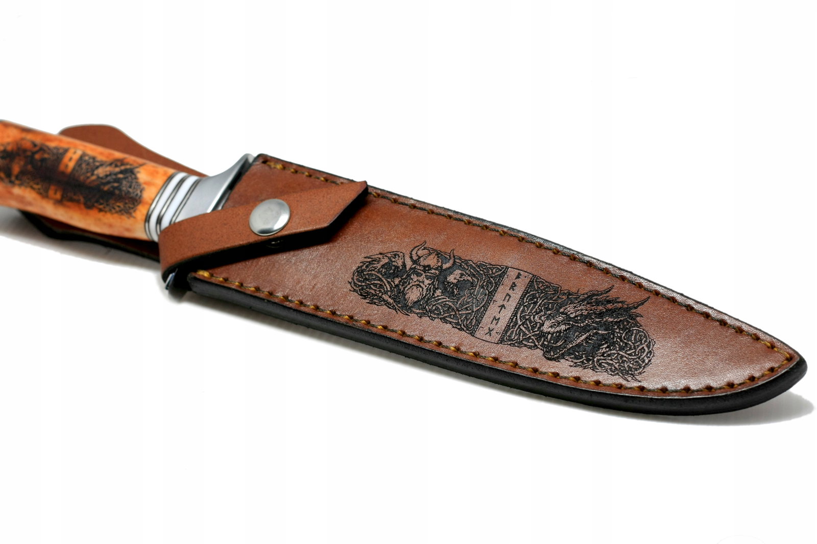 !! UWAGA: Skórzane pochwy wyciągają wilgoć z powietrza i mają tendencję do rdzewienia noży jeśli nie są prawidłowo przechowywane. Kiedy skończysz używać nóż, wyczyść go dokładnie i odłóż OD skórzanej pochwy, nałóż na niego olej do pistoletu, "Seal 1" lub podobny środek ochronny i przechowuj. Damascus, 1095HC i D2 mogą rdzewieć i rozwijać plamy jeśli nie są smarowane. Stal 1095HC może matowieć i zmieniać kolor ostrza na czarny, gdy krew i kwaśne płyny lub chemikalia dostaną się na ostrze. Ostrze nie straci swoich właściwości tnących, ale straci satynowy kolor. !!!