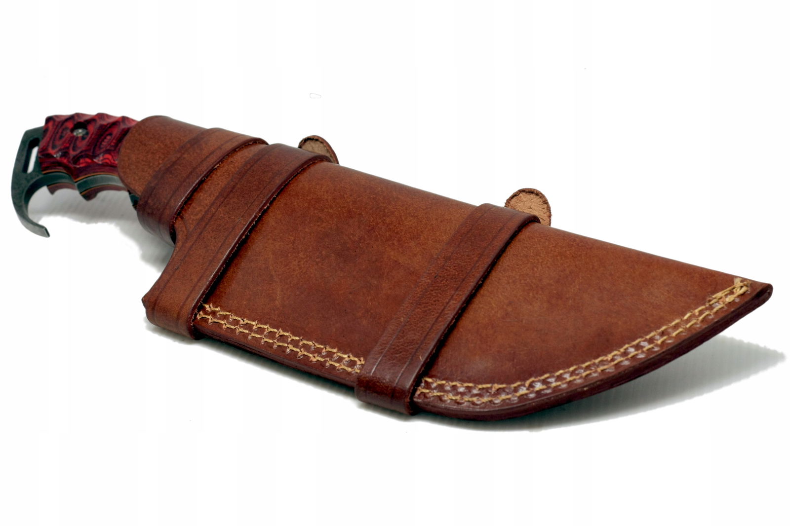 !! UWAGA: Skórzane pochwy wyciągają wilgoć z powietrza i mają tendencję do rdzewienia noży jeśli nie są prawidłowo przechowywane. Kiedy skończysz używać nóż, wyczyść go dokładnie i odłóż OD skórzanej pochwy, nałóż na niego olej do pistoletu, "Seal 1" lub podobny środek ochronny i przechowuj. Damascus, 1095HC i D2 mogą rdzewieć i rozwijać plamy jeśli nie są smarowane. Stal 1095HC może matowieć i zmieniać kolor ostrza na czarny, gdy krew i kwaśne płyny lub chemikalia dostaną się na ostrze. Ostrze nie straci swoich właściwości tnących, ale straci satynowy kolor. !!!