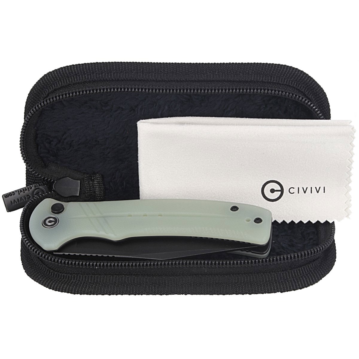 Rękojeść - wykonana z jasnego G10, kompozytowego materiału włokna szklanego prasowanego pod ciśnieniem z syntetyczną żywicą. Fazowane krawędzie okładek eliminują ostre krawędzie dla wygody, a wykonany z przodu i z tyłu na linersach jimping poprawia pewność uchwytu. Otwarta konstrukcja tzw. open-backed mocowana stalowymi tulejami dystansowymi redukuję wagę oraz ułatwia czyszczenie. Oś pivota zdobi stylizowane logo marki Civivi. Dwupozycyjny, prawo/lewostronny klips deep carry pozwala przenosić dyskretnie nóż w kieszeni w pozycji tip-up (czubkiem ostrza ku górze).