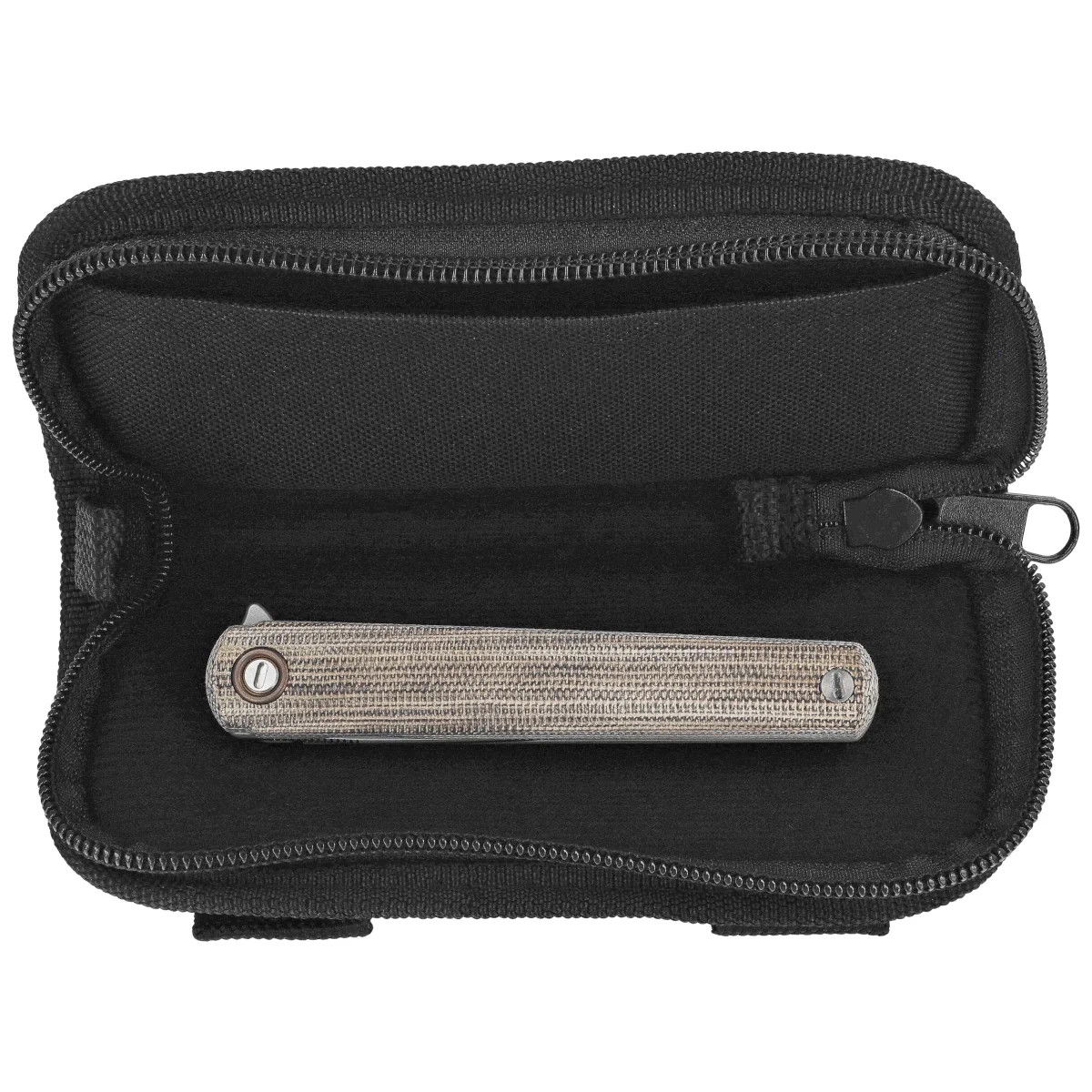 Rękojeść - z Canvas Micarty, materiału łączącego niską masę z wysoką odpornością na zużycie i warunki atmosferyczne. Lekko teksturowana powierzchnia zwiększa przyczepność, nawet w wilgotnym środowisku. Konstrukcja oparta na stalowych linersach skręconych przy pomocy dystansowej tulei zapewnia sztywność przy zachowaniu minimalnej wagi. Obustronny, głęboko osadzony deep carry clip umożliwia dyskretne przenoszenie foldera w kieszeni, zarówno przez użytkowników prawo-, jak i leworęcznych. Subtelny detal w postaci anodyzowanego pierścienia wokół pivota dodaje projektowi charakterystycznego akcentu. Folder dostarczany jest w miękkim etui z Cordury z zamkiem i opcją troczenia do paska – idealnym do bezpiecznego przenoszenia lub przechowywania. W zestawie znajdują się również klucze torx T6/T8.