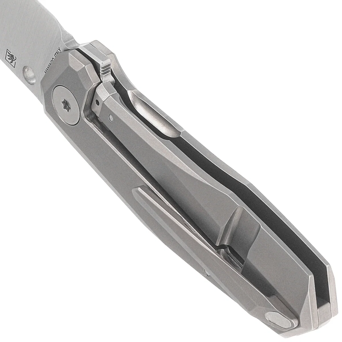 Rękojeść - lity tytan 6AL4V, piaskowany dla lepszego chwytu. Fazowane krawędzie okładek eliminują ostre ranty dla wygody i poprawiają pewność uchwytu. Połączone ze sobą masywnym tytanowym backspacerem zapewniającym sztywność całej konstrukcji. Prostota i solidność budowy dają pewność wieloletniego użytkowania. Klips jednopozycyjny (prawa), wykonany z tytanu, umożliwia przenoszenie noża w pozycji tip-up.
