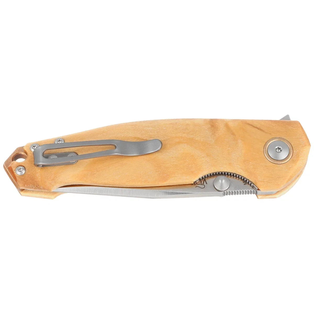 Rękojeść - okładziny z drewna topoli połączone ze sobą przy pomocy frezowanego obrabiarkami CNC backspacera, dzięki czemu nóż zachowuje pożądaną sztywność konstrukcji. Backspacer oraz ozdobny pierścień wokół pivota tzw. pivot collar wykonano z brązu fosforowego (phosphor bronze). Wykonane z przodu podcięcie na palce (fore finger groove) poprawia pewność uchwytu, tworząc jednocześnie z flipperem gardę zapobiegającą ześlizgnięciu się dłoni na ostrze. Prawostronny, jednopozycyjny tytanowy klips deep carry, pozwala przenosić dyskretnie nóż w pozycji tip-up (czubkiem do góry). Na końcu rękojeści lanyard hole, otwór na linkę.