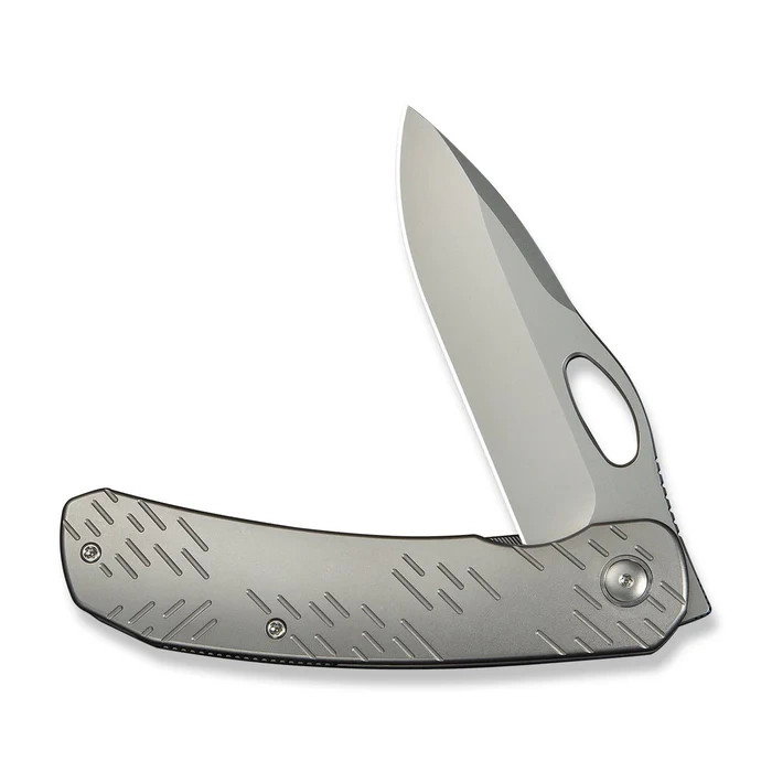 Rękojeść - powstała z frezowanego tytanu 6Al-4V, gwarantującego wysoką odporność mechaniczną, sztywność konstrukcji oraz pełną odporność na korozję przy zachowaniu niskiej masy całkowitej. Subtelne raindrop milling poprawia chwytność, podnosząc ergonomię oraz estetykę rękojeści. Wyprofilowanie bocznych krawędzi oraz zaokrąglone linie wspierają naturalne ułożenie dłoni, minimalizując zmęczenie przy dłuższej pracy. Konstrukcję uzupełnia precyzyjnie dopasowany backspacer oraz tytanowy klips deep-carry tip-up, umożliwiający dyskretne przenoszenie noża w kieszeni. Dodatkowe miejsce na linkę zabezpieczającą zwiększa funkcjonalność podczas pracy w terenie. Całość utrzymana jest w stonowanej stylistyce użytkowego minimalizmu klasy premium.