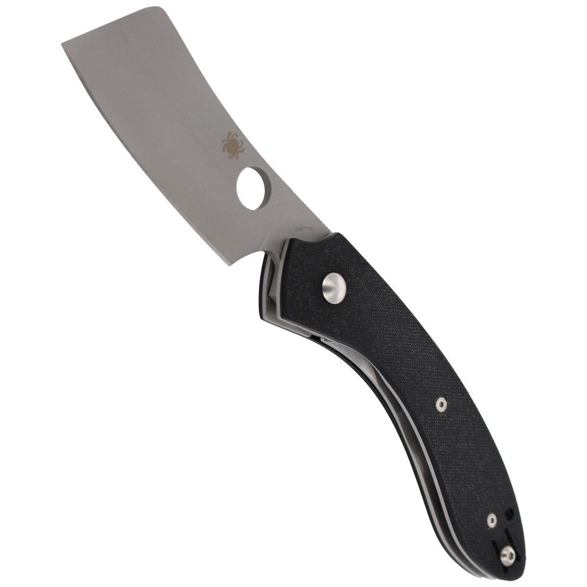 Głownia - o profilu Cleaver (tasaka), grubości 3 mm, wyprowadzone szlifem wysokim płaskim (Saber Grind). Tępo zakończone gładkie ostrze Plain pokryto szarym, matowym wykończeniem. Długa linia karbowanych nacięć Jimping, na grzbiecie głowni zapewnia solidne podparcie dla kciuka a okrągłe wycięcie SpyderHole (patent Spyderco) umożliwia szybkie jej otwarcie.