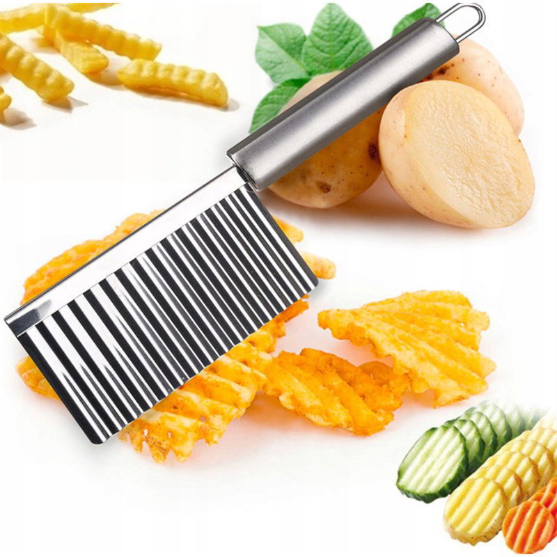 Funkcjonalny nóż do krojenia ziemniaków wykonany ze stali, idealny do przygotowywania frytek, talarków i innych warzyw. Solidna konstrukcja zapewnia trwałość i wygodę podczas użytkowania.