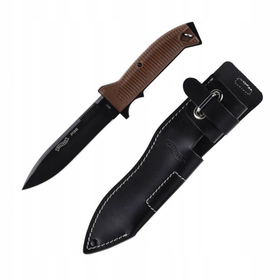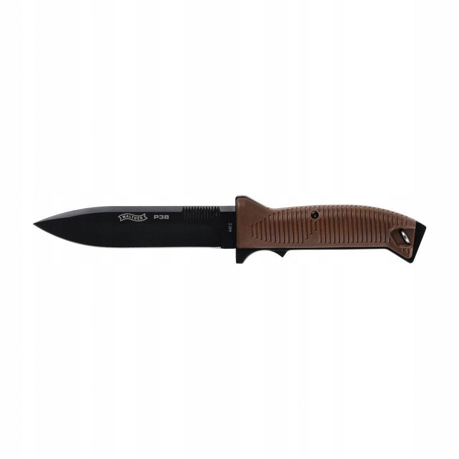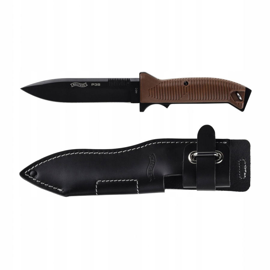 P38 niemieckiej firmy Walther to wielozadaniowy nóż zaprojektowany do pracy w terenie. Ostrze o charakterystyce Spear Point wykonano ze stali nierdzewnej 440C o twardości 57-59 HRC. Model posiada konstrukcję full tang, która zwiększa jego wytrzymałość i odporność na złamanie. Okładziny rękojeści z wytrzymałego Polimeru wzorowane na pistolecie P38 przymocowano śrubami do stali oraz odpowiednio wyprofilowano, tak aby zapewnić pewny chwyt w każdych warunkach. Bezpieczeństwu pracy sprzyja jelec zabezpieczający dłoń przed zsunięciem się na krawędź tnącą, a także ząbkowana górna krawędź głowni stanowiąca stabilne podparcie dla palca. Stalowe zakończenie narzędzia posiada otwór na linkę. W zestawie znajduje się skórzana pochwa do wygodnego transportowania noża przy pasie lub wyposażeniu. Ten kompaktowy i lekki model P38 jest chętnie wybierany i ceniony przez ludzi aktywnie zajmujących się survivalem jak również przez zawodowych żołnierzy i pracowników służb mundurowych na całym świecie.