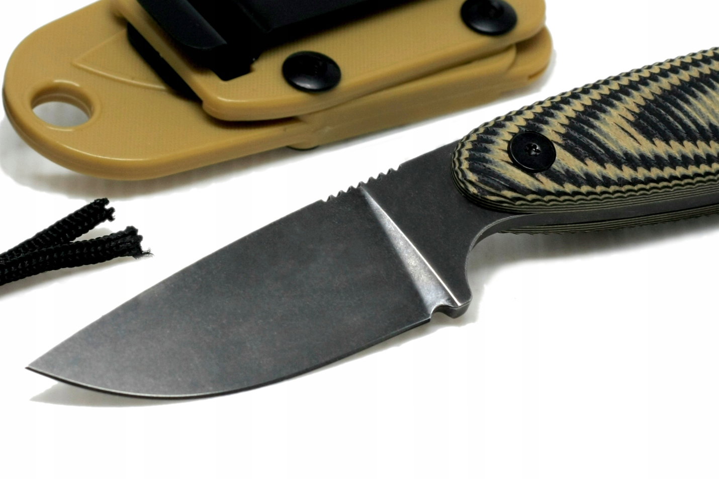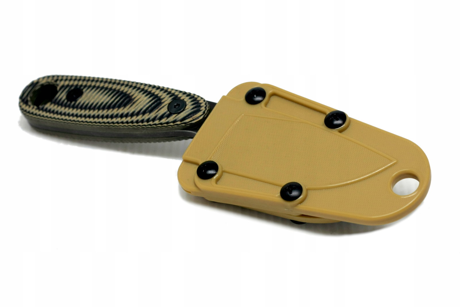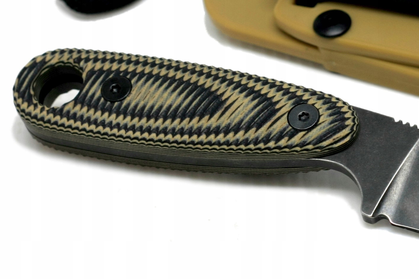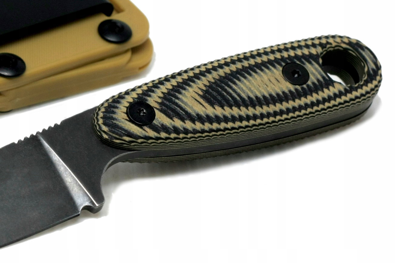 - Rękojeść: G10 (Laminat z warstw włókna szklanego zatopionego w żywicy epoksydowej. Wytrzymały, odporny na uderzenia, działanie większości czynników chemicznych oraz niskich i wysokich temperatur. Nie przewodzi prądu elektrycznego. Dzięki procesom trawienia, grawerowania lub piaskowania można uzyskać faktury antypoślizgowe o doskonałej przyczepności. Stosowany na rękojeści wysokiej klasy noży z głownią stałą oraz jako zewnętrzne okładziny bądź szkielet w nożach składanych.)