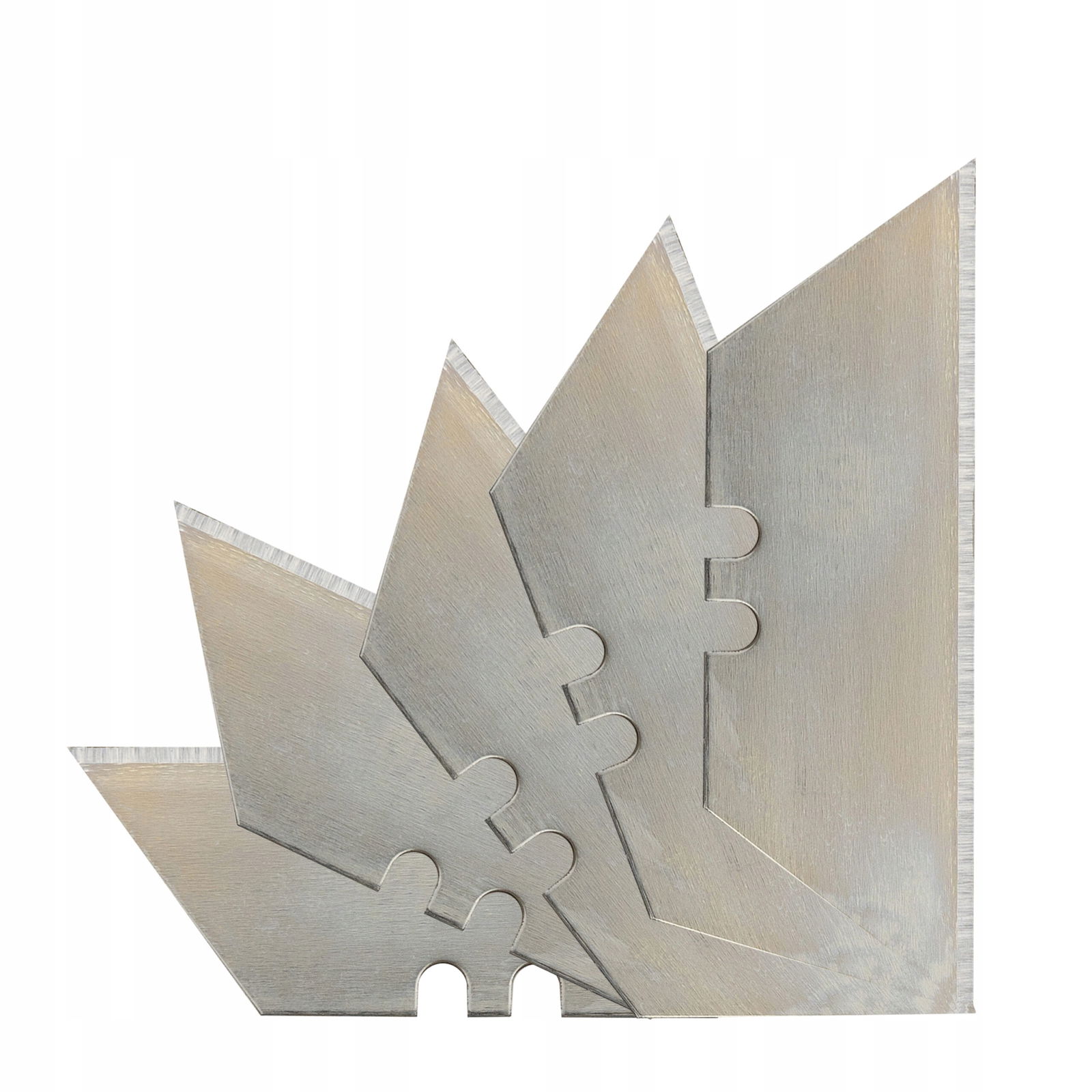 W zestawie znajduje się pięć dwustronnych ostrzy o szerokości 18 mm i długości użytkowej 30 mm, co pozwala na ich wymianę w razie potrzeby.