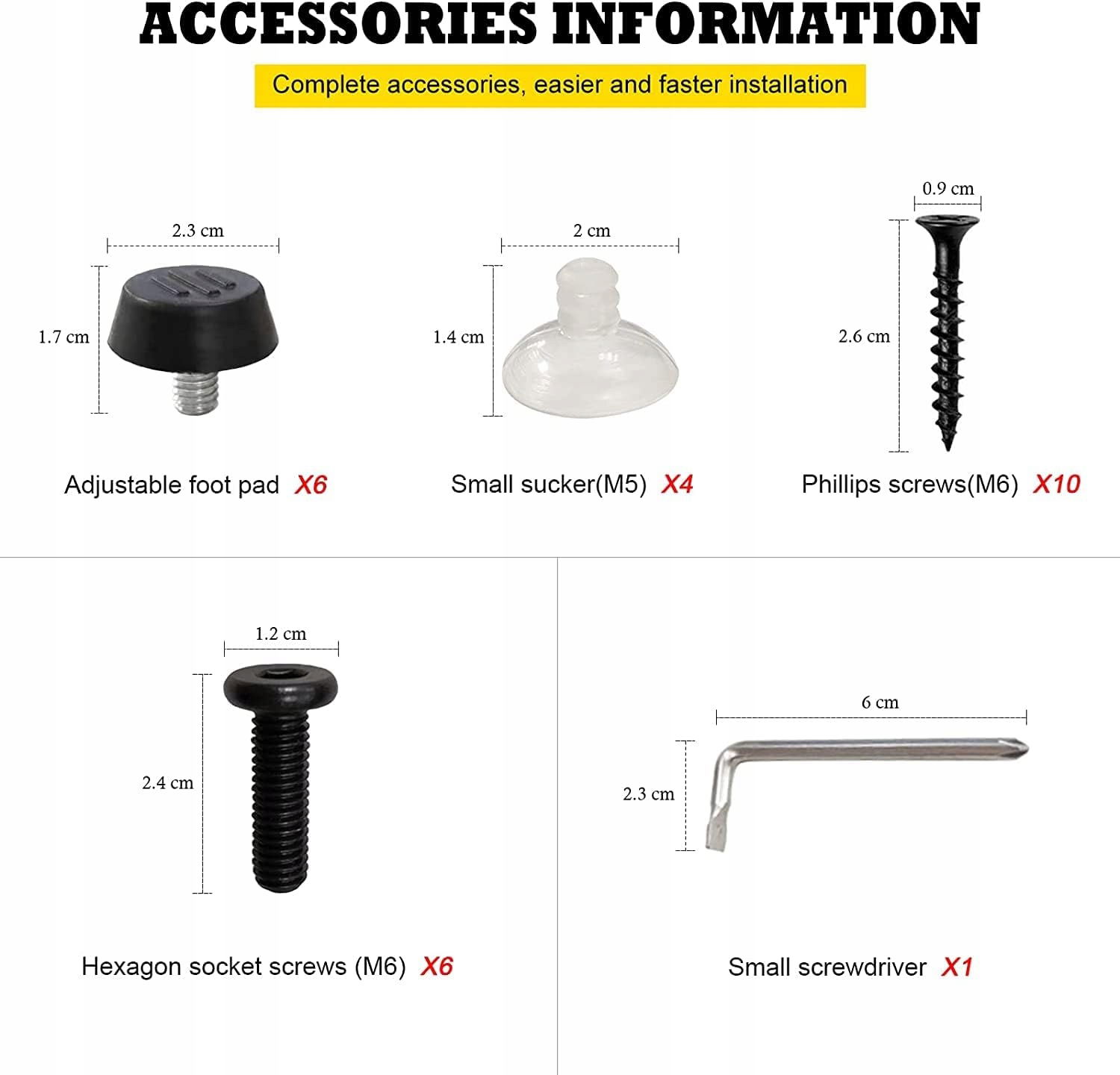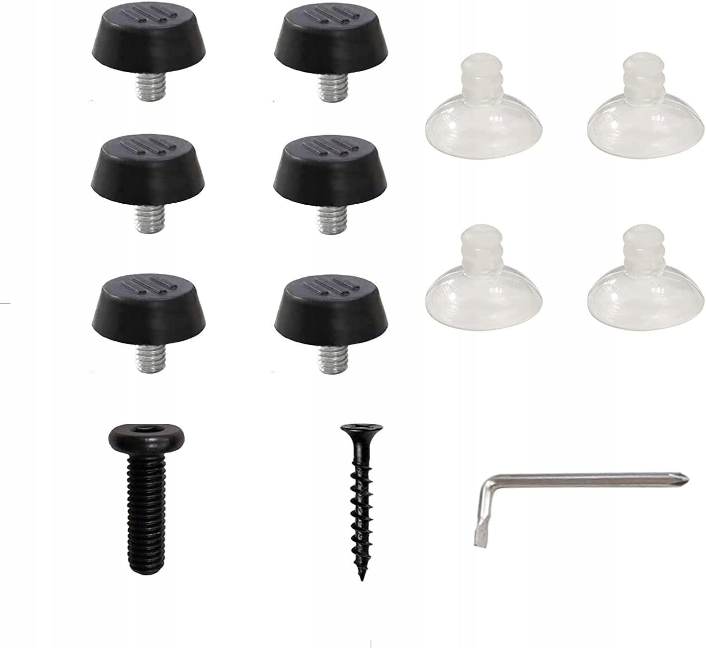 【Akcesoria do nóg w kształcie litery V/T】: 4 x przyssawki; 10 x śrub krzyżakowych; 6 x kluczy nasadowych imbusowych; 1 x mały śrubokręt; 6 x ochronna podkładka gumowa, która służy jako dodatkowa stabilność stołu, a także chroni podłogę przed uszkodzeniami.