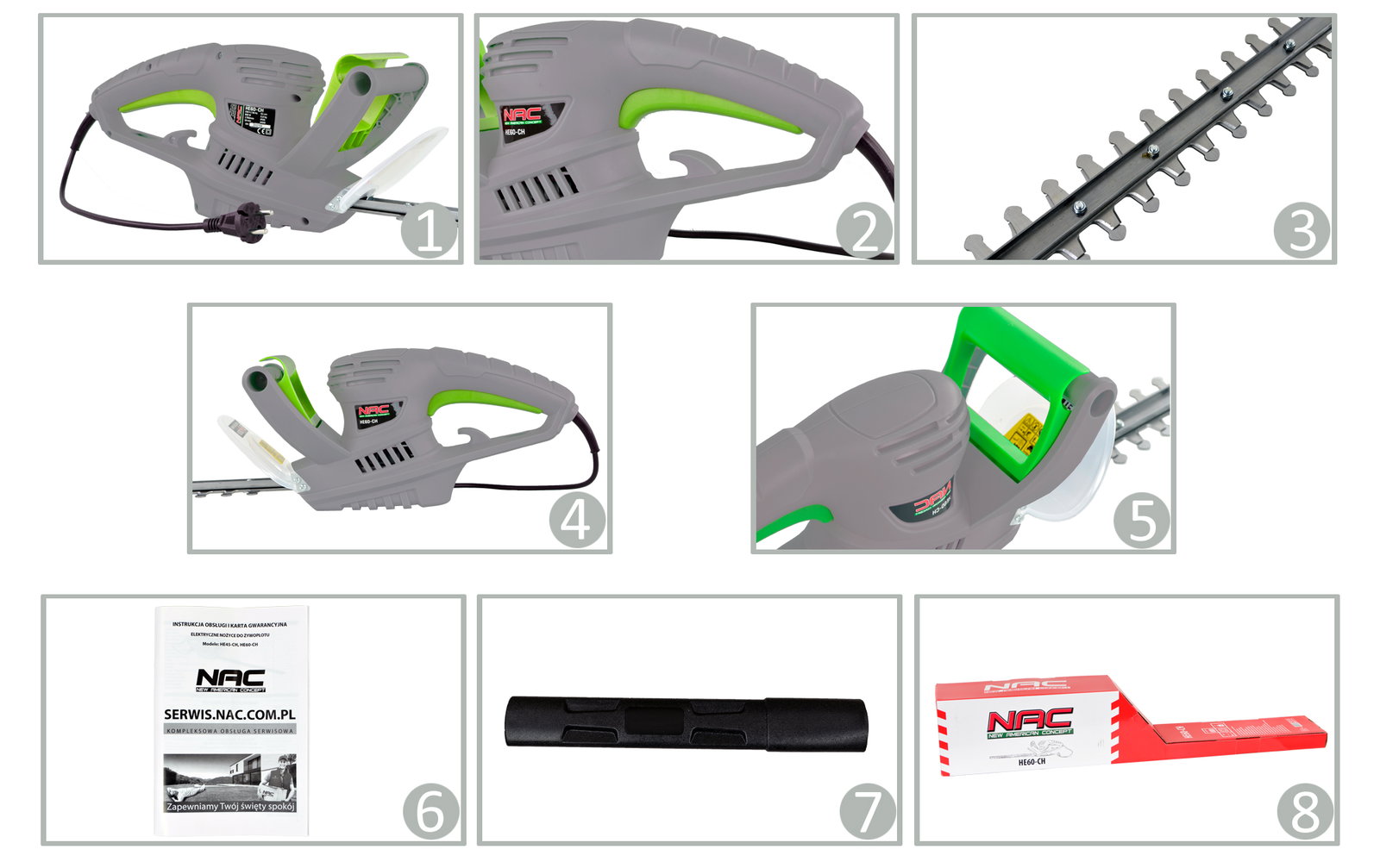 Elektryczne nożyce do cięcia żywopłotów i krzewów firmy NAC o symbolu HE 60-CH, zostały wyposażone w elektryczny silnik o mocy 600 W uzyskujący prędkość obrotową na poziomie 1700 obr/min. Znajdują zastosowanie w każdym ogrodzie podczas cięcia żywopłotów lub formowania krzewów.