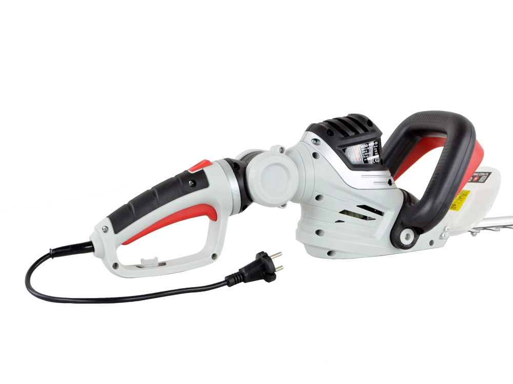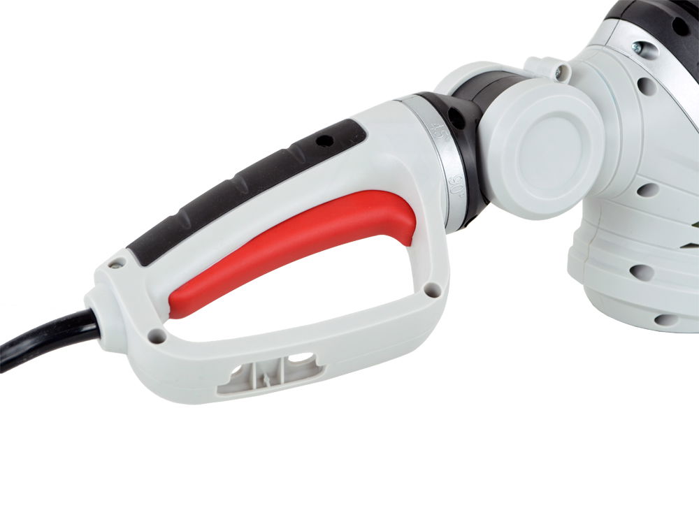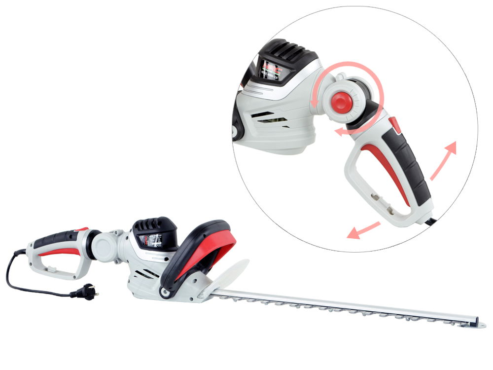 Nożyce posiadają bardzo wygodną obrotową i pochylaną rękojeść, na której zamontowany został podwójny włącznik zabezpieczający przed niepożądanym uruchomieniem. Zmianę pochylenia rękojeści dokonujemy za pomocą przycisku znajdującego się na obudowie. Po jego naciśnięciu i przytrzymaniu zwalniany jest mechanizm blokujący co pozwala ustawić rękojeść w żądanym położeniu.