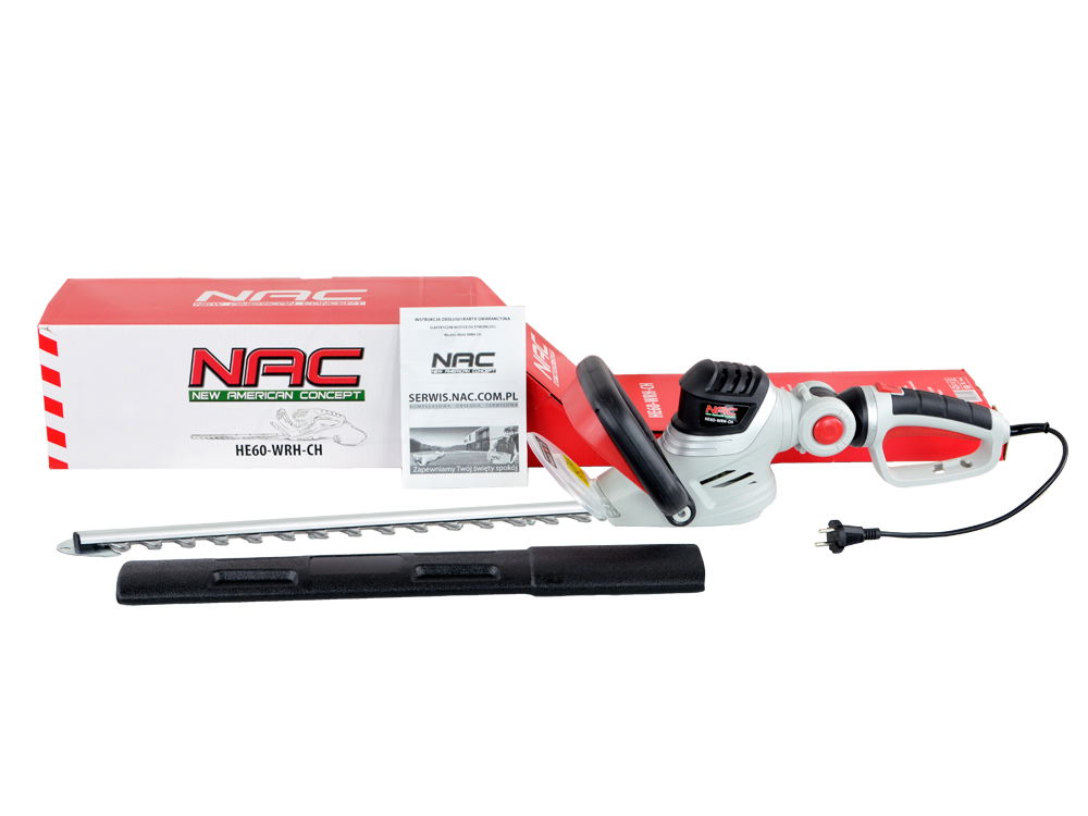 Elektryczne nożyce do cięcia żywopłotów i krzewów firmy NAC o symbolu HE60-WRH-CH , zostały wyposażone w elektryczny silnik o mocy 600 W uzyskujący prędkość obrotową na poziomie 1400 obr/min. Znajdują zastosowanie w każdym ogrodzie podczas cięcia żywopłotów lub formowania krzewów.