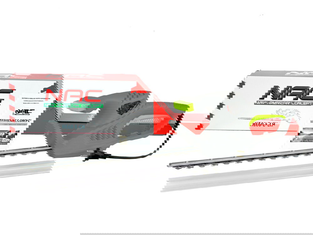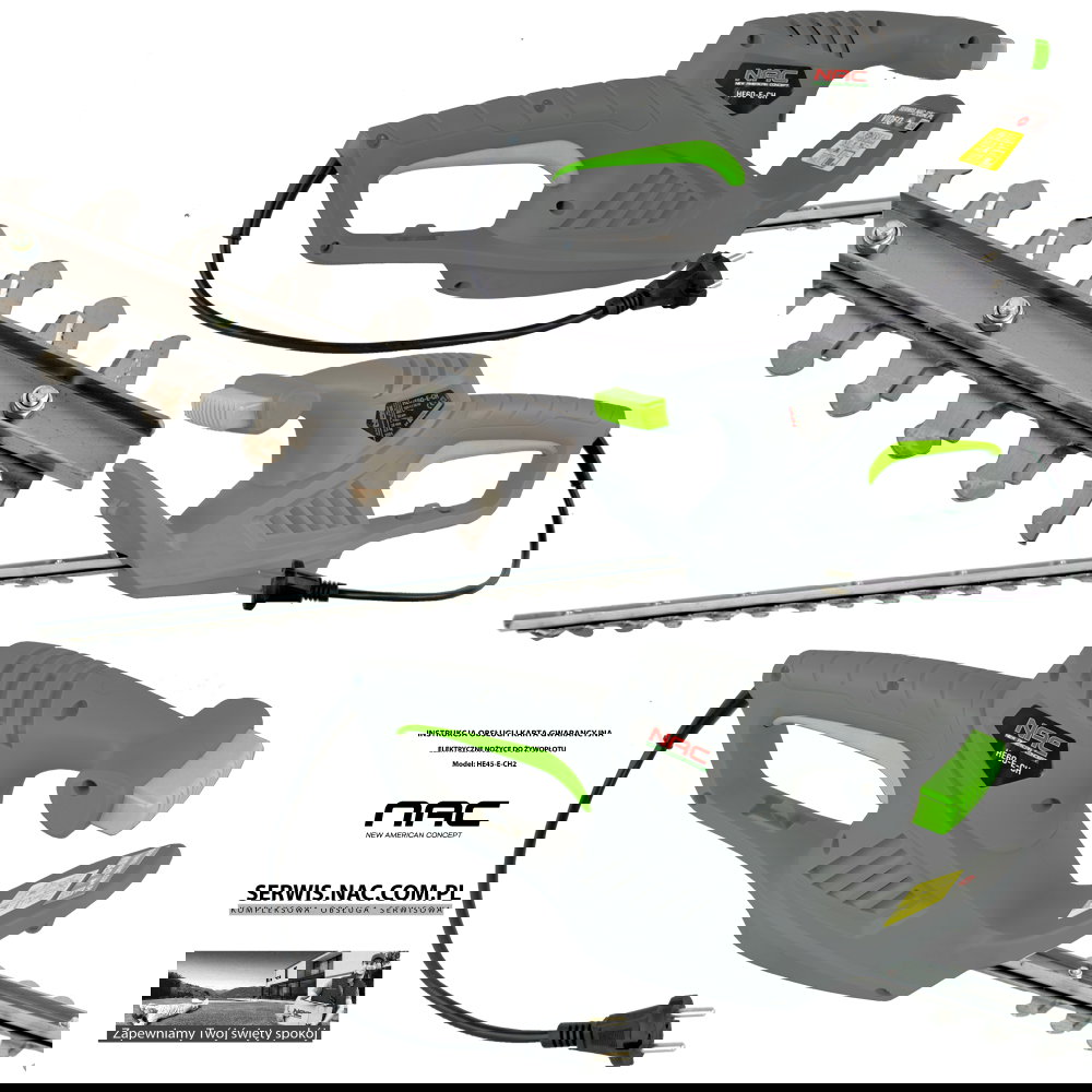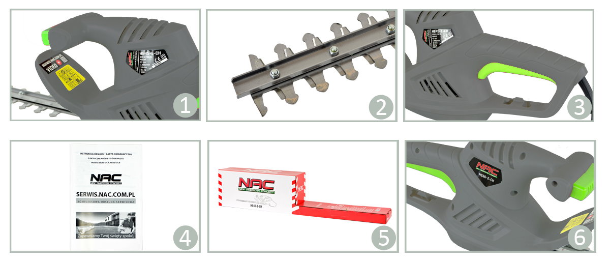 Elektryczne nożyce do cięcia żywopłotów i krzewów firmy NAC o symbolu HE 60-E-CH, zostały wyposażone w elektryczny silnik o mocy 600 W uzyskujący prędkość obrotową na poziomie 1700 obr/min. Znajdują zastosowanie w każdym ogrodzie podczas cięcia żywopłotów lub formowania krzewów.