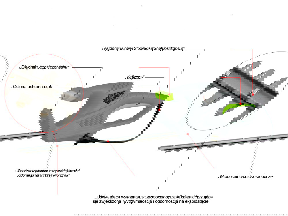 Nożyce posiadają bardzo wygodną rękojeść, na której zamontowany został podwójny włącznik zabezpieczający przed niepożądanym uruchomieniem.
