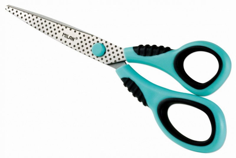 Nożyczki biurowe o długości 20,5 cm z ostrzem w kropki ze stali nierdzewnej. Turkusowy plastikowy uchwyty z czarnymi detalami w środku wyściełany gumą, odporny na wstrząsy.