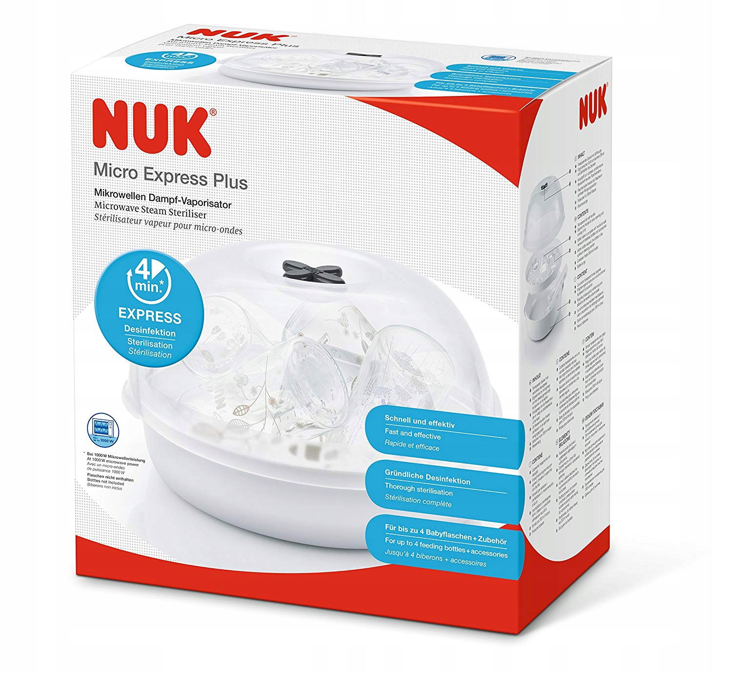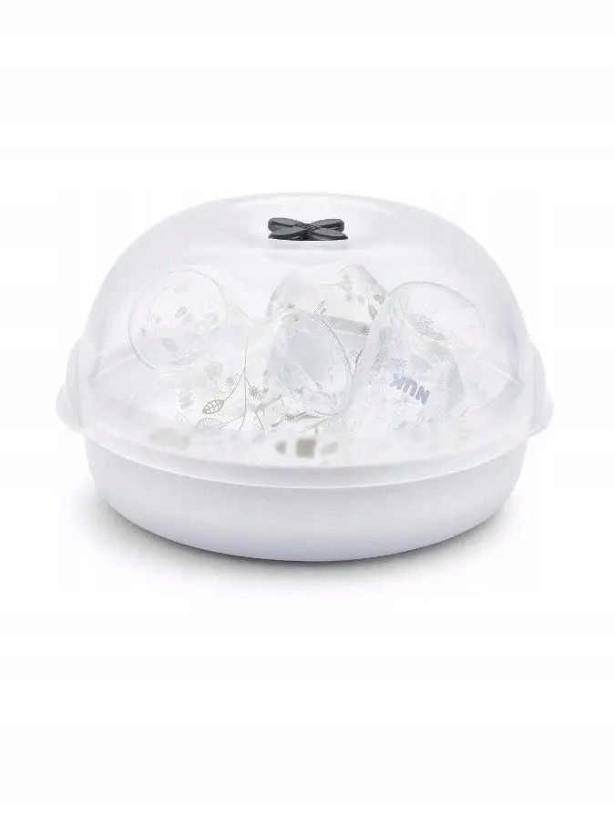 Sterylizator parowy do kuchenki mikrofalowej NUK Micro Express Plus to idealne rozwiązanie dla wymagających rodziców. Umożliwia szybką, skuteczną i jednoczesną sterylizację aż czterech butelek o pojemności 300 ml.