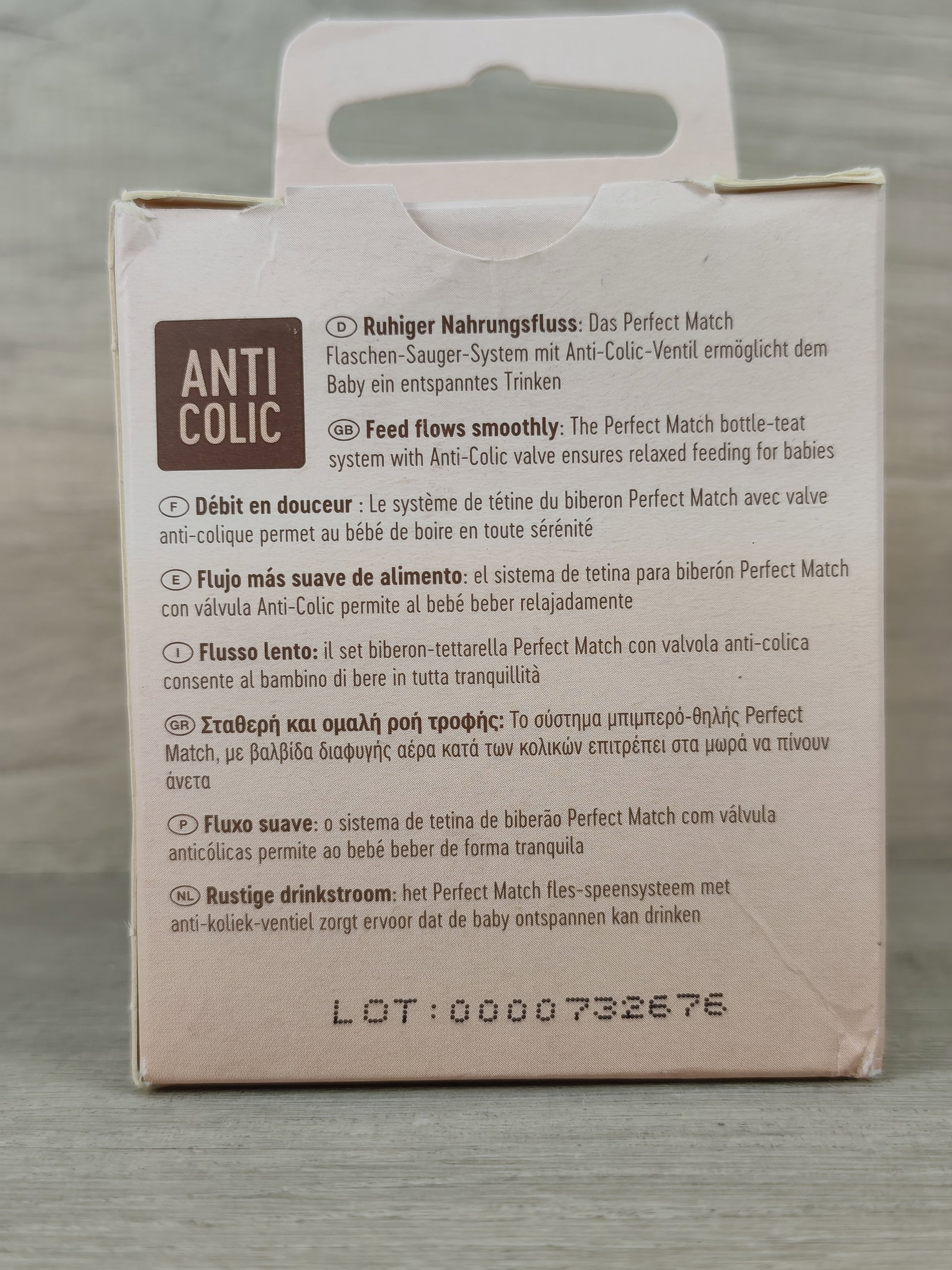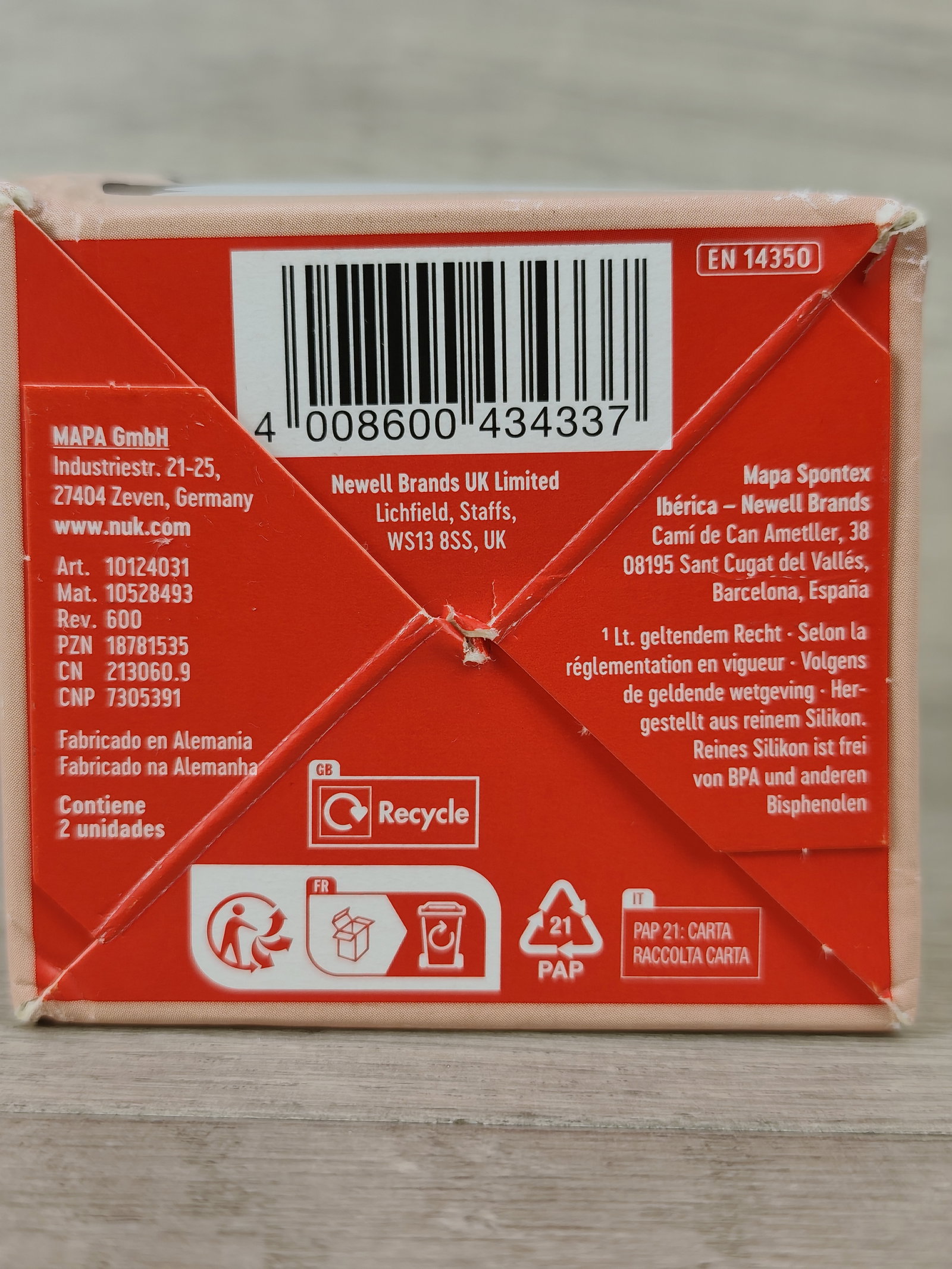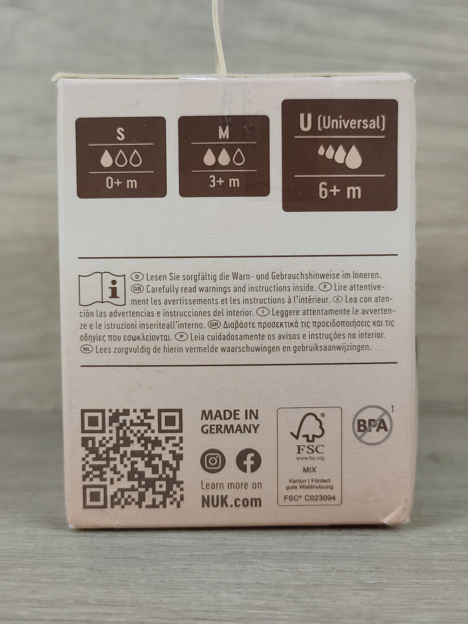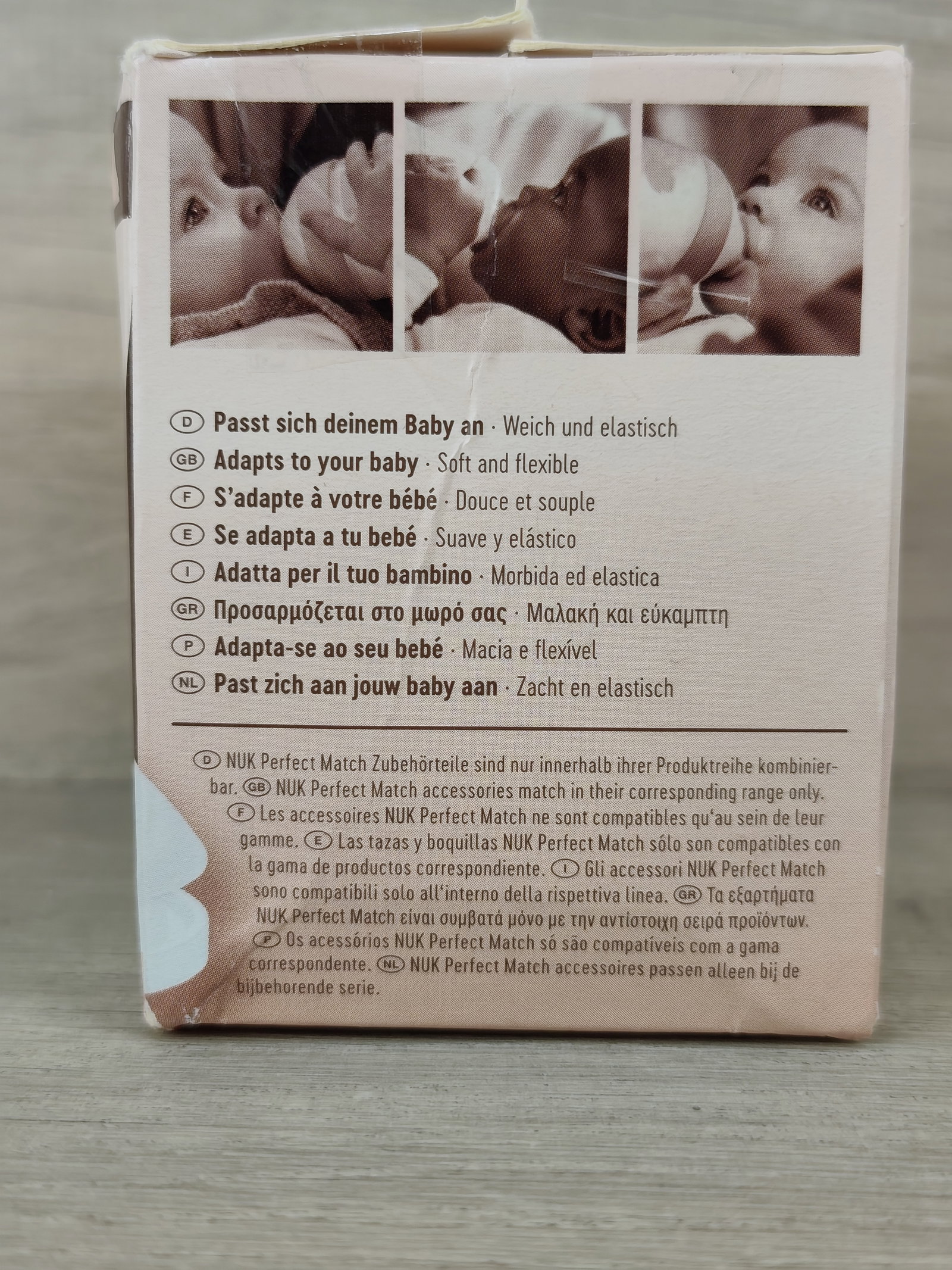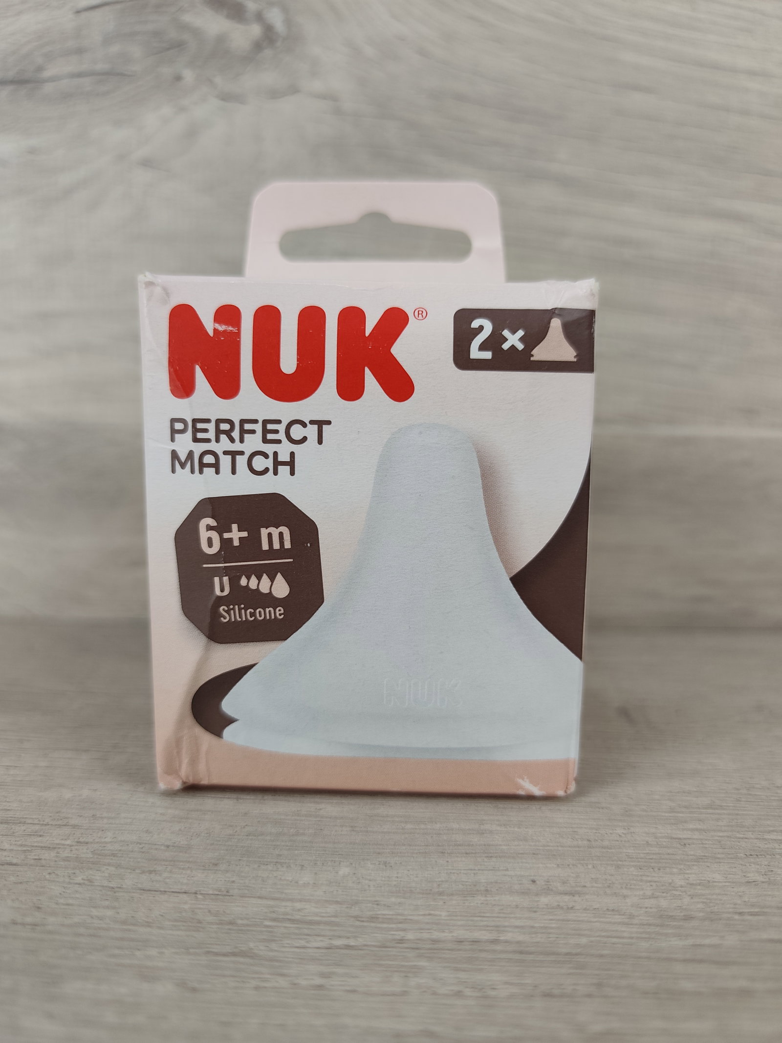 W opakowaniu znajdują się 2 smoczki, kompatybilne z butelkami NUK Perfect Match. Wykonane z bezpiecznego, miękkiego silikonu bez BPA.