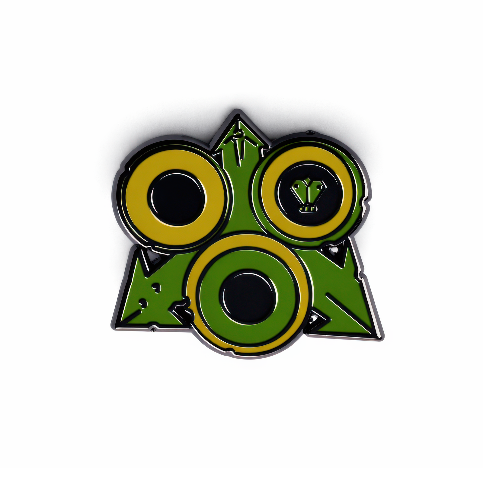 Design przypinki koncentruje się na trzech wyrazistych, zielonych emaliowanych okręgach, z których każdy jest obramowany złotem i zawiera wyraźny czarny centralny obszar. Najwyższy okrąg wyraźnie prezentuje ikoniczny motyw trójpalczastej dłoni Nurgle, symbolizujący rozpad, chorobę i akceptację. Te trzy symbole osadzone są na ciemniejszym, szmaragdowozielonym trójkątnym tle, z stylizowanymi wypustkami przypominającymi liście. Dodając do zarazy estetyki, krawędzie tej zielonej figury zdobią małe, brodawkowate wypustki. Wszystkie elementy wykonane są z wysokiej jakości metalowej podstawy, oferującej premium odczucie i trwałość, natomiast praca emaliowa zapewnia gładkie, polerowane wykończenie. Paleta kolorów – głęboka zieleń, żywe zielone akcenty, lśniące złoto, ostra czerń i wypolerowany metal – doskonale oddaje tematykę Nurgle: skorumpowanego życia, zarazy i ironicznej opulencji.
