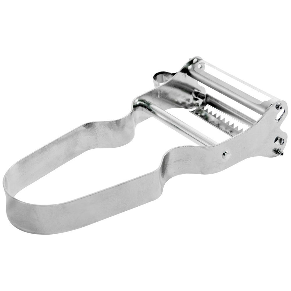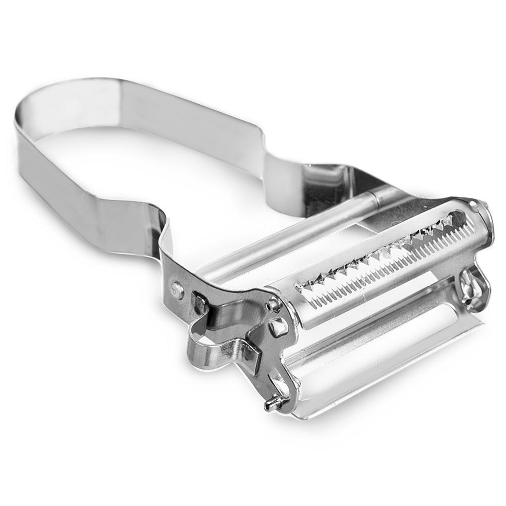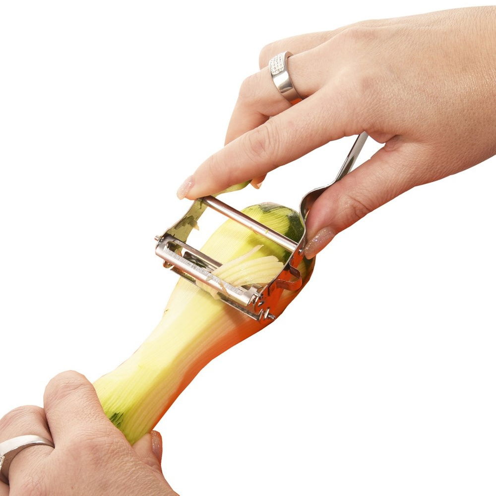 Podwójny obierak do warzyw i owoców, przydatny w każdej kuchni. Sprawdzi się do szybkiego i łatwego obierania skórek np. z ziemniaków, jabłek czy pomidorów. Idealny do krojenia cienkich plastrów lub dekorowania. Obierak posiada praktyczny uchwyt i ostre ostrza, co sprawia, że korzystanie z niego jest bardzo wygodne. Dzięki niemu łatwo obierzesz świeże warzywa i owoce.