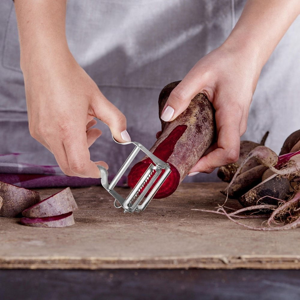 WIELOFUNKCYJNY - Posiada dwa ostrza - jedno do klasycznego obierania warzyw lub owoców, drugie do wycinania podłużnych pasków. Z boku posiada końcówkę do wykrawania zanieczyszczeń i kiełków, a także do dekoracyjnych żłobień.