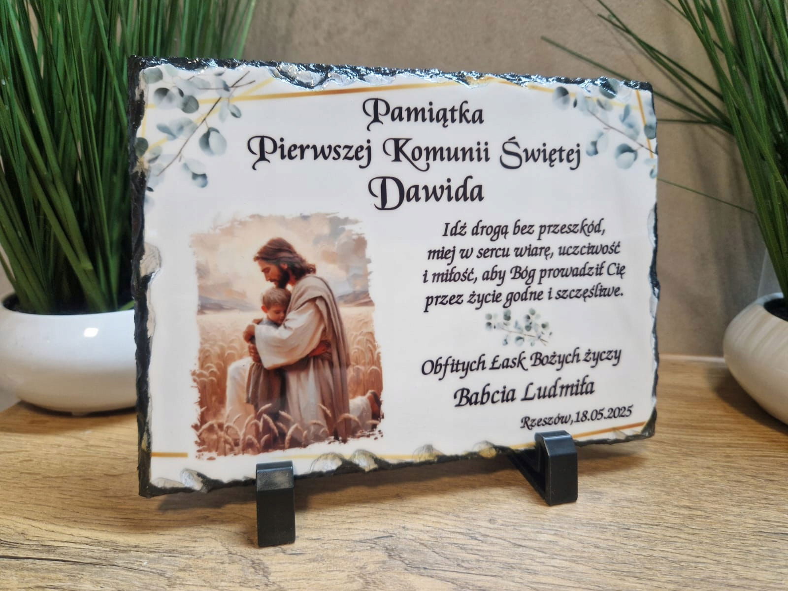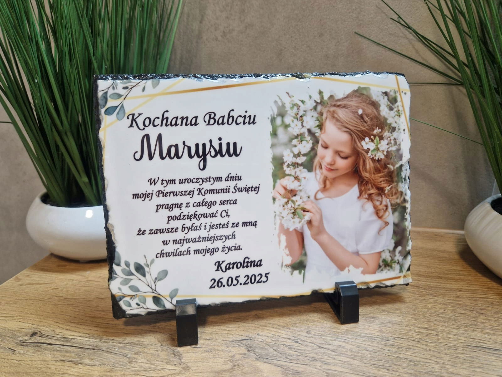 Tabliczka z płyty granitowej z dedykacją oraz zdjęciem dziecka – idealne podziękowanie z okazji Pierwszej Komunii Świętej.