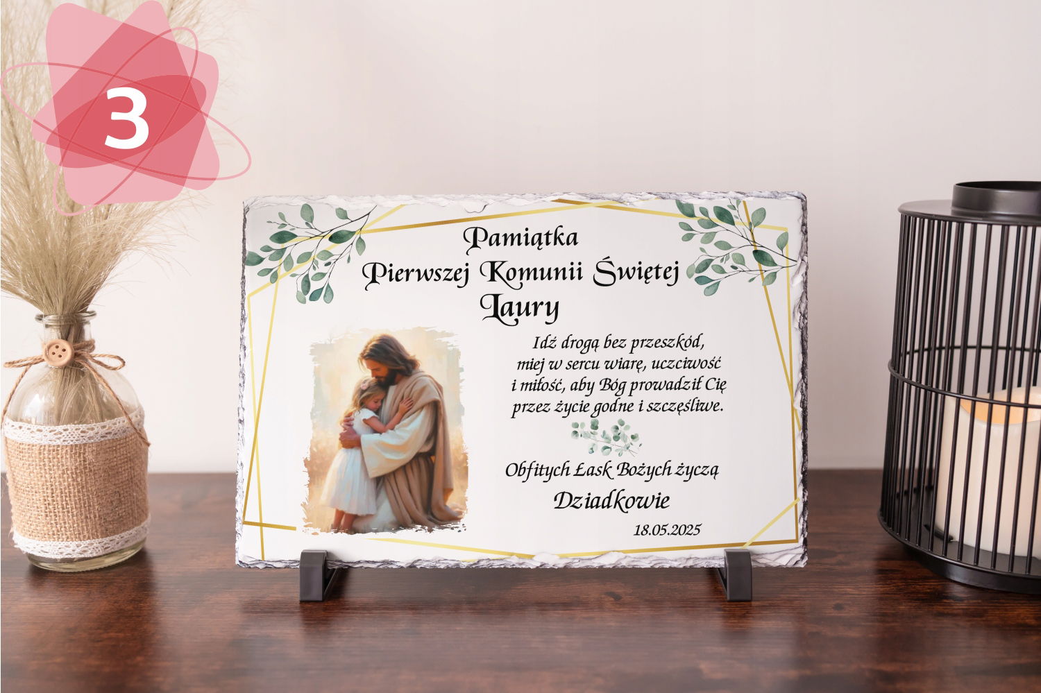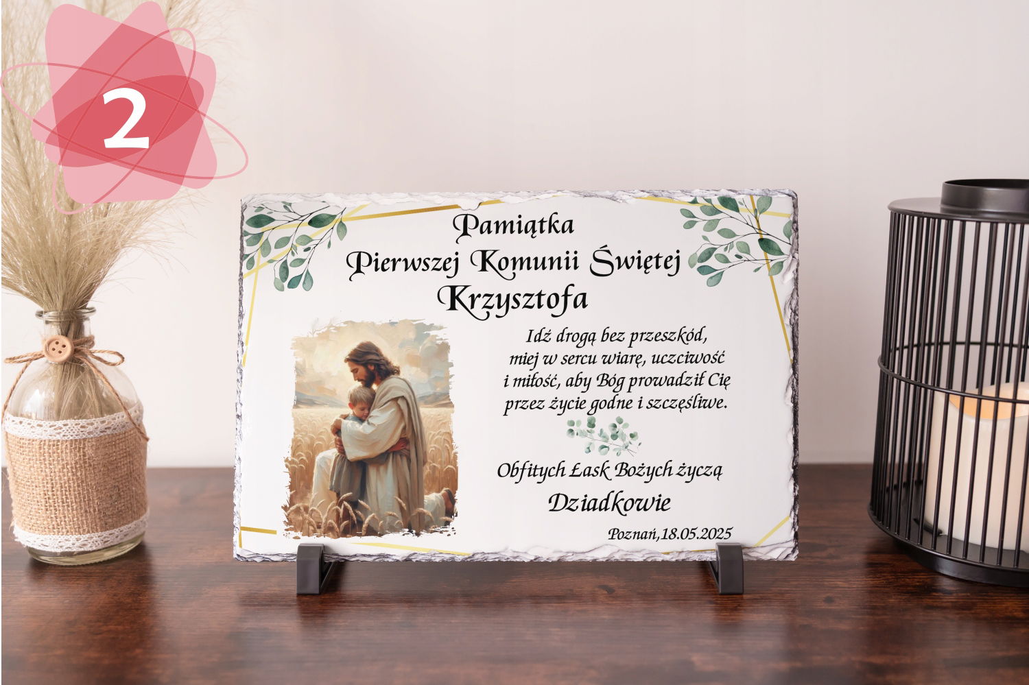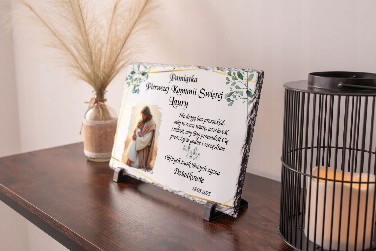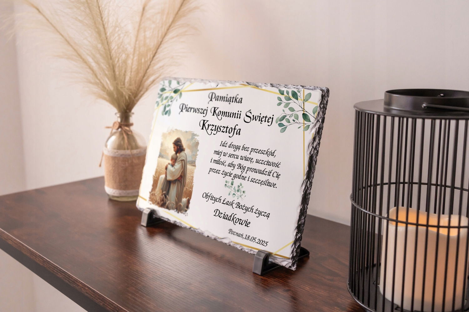 Ta wyjątkowa tabliczka wykonana z trwałego granitu stanowi eleganckie i ponadczasowe podziękowanie za przybycie na tak ważną uroczystość jaką jest Pierwsza Komunia Święta.