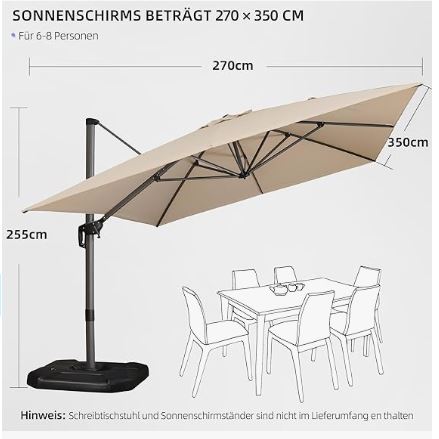 - Wymiary tego parasola przeciwsłonecznego wynoszą 270 x 350 cm, zapewnia dużo cienia dla optymalnego pokrycia, utrzymuje chłód i ciesz się częścią wypoczynkową na świeżym powietrzu.