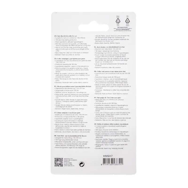 Zapnij obrożę luźno wokół szyi kota i skróć nadmiar długości. W przypadku kotów, które wciąż rosną, należy regularnie sprawdzać, czy obroża jest odpowiednio dopasowana do zwierzęcia. Odpowiednia dla kotów w wieku 12 tygodni lub starszych. Obroża zawiera bezpieczne składniki.