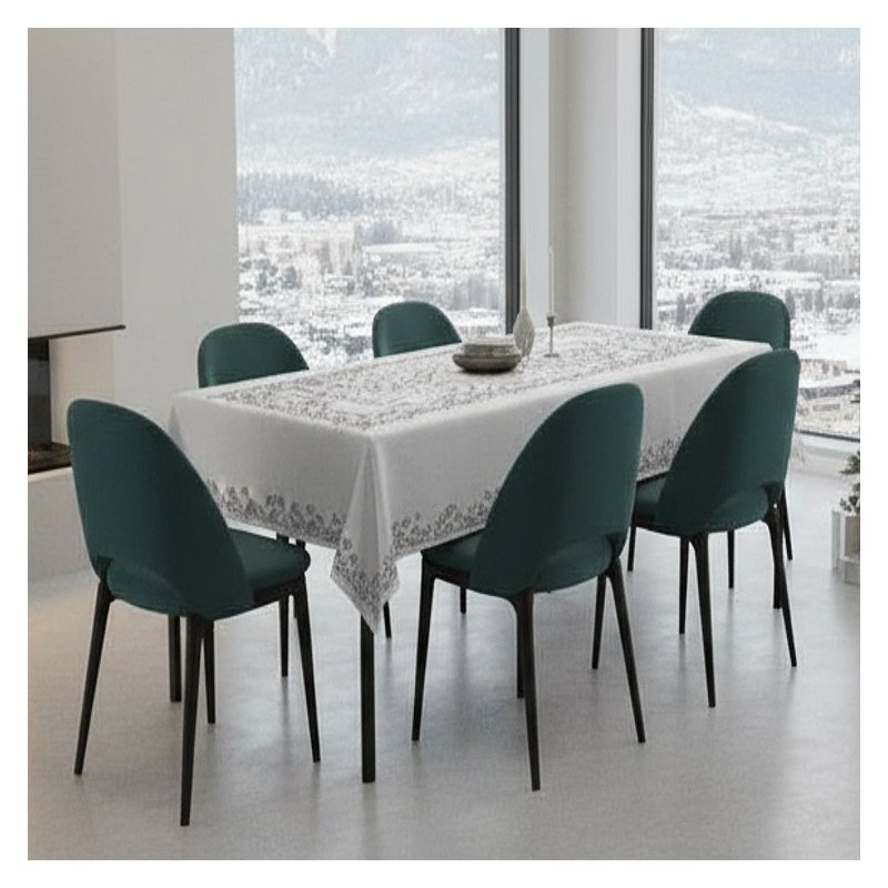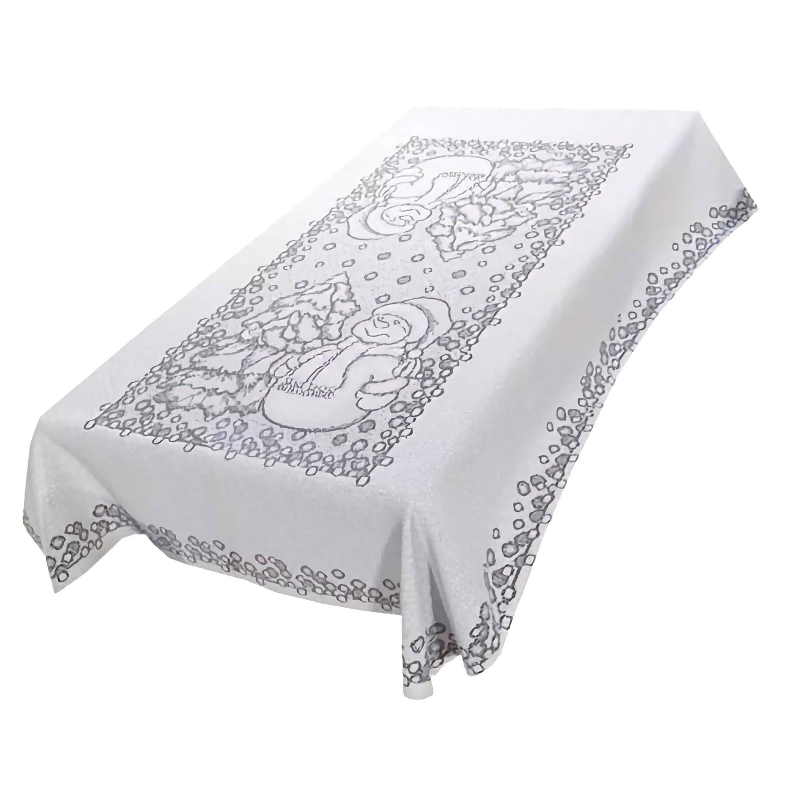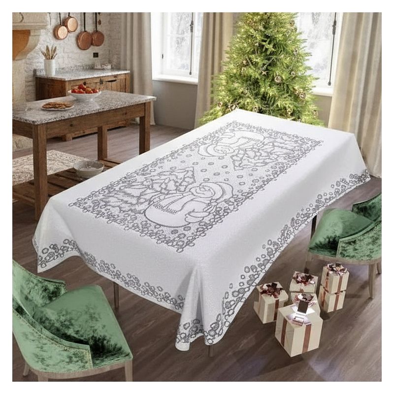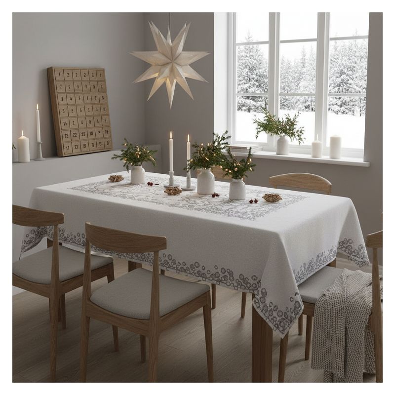 Piękny obrus o wymiarach 110 x 130 cm w klasycznej białej kolorystyce z pewnością przyciągnie uwagę gości podczas rodzinnych spotkań w okresie Bożego Narodzenia.
