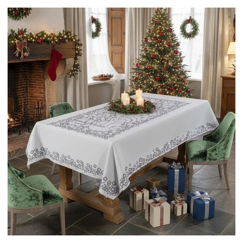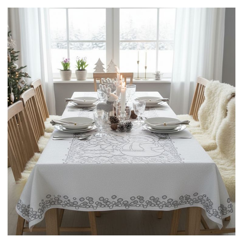 Już dziś przygotuj swój stół na magię świąt Bożego Narodzenia z naszym obrusem Białe Bałwanki w rozmiarze 110 x 130 cm.