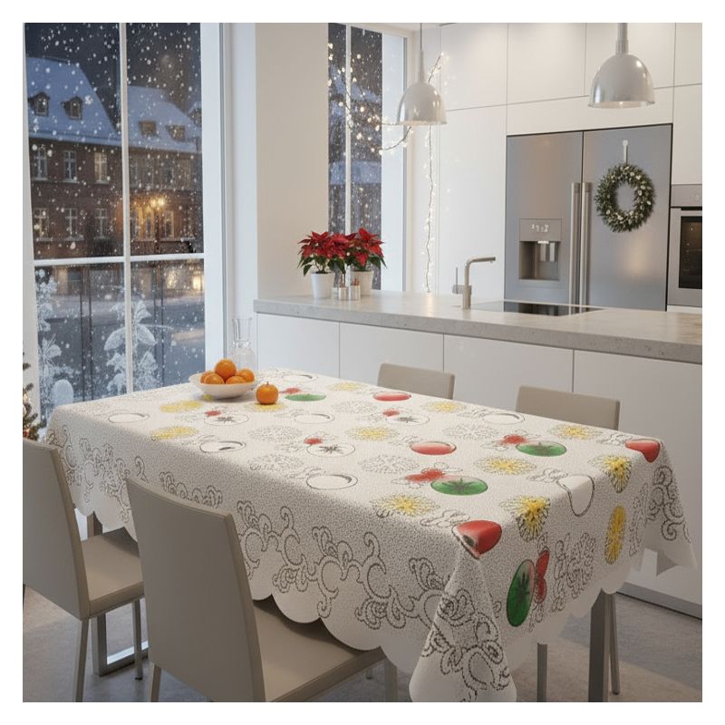 Wielokolorowe tradycyjne bożonarodzeniowe motywy zdobiące biały obrus wprowadzą do wnętrza Twojego domowego zacisza radosny, świąteczny nastrój w zimowym okresie roku.
