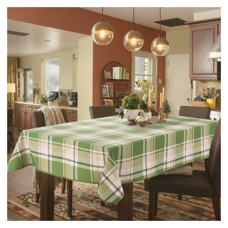 Modna krata w zielonej kolorystyce sprawia, że obrus jest atrakcyjnym wizualnie uzupełnieniem zarówno klasycznych, jak i nowoczesnych aranżacji wnętrz.