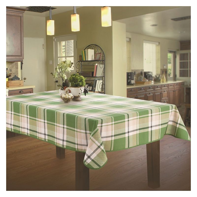 Plamoodporny obrus ozdobiony jest drukowanym wzorem kraty w zielonej kolorystyce - kolor jest wyrazisty i trwały, obrus zachowa swój wygląd nawet po wielokrotnym praniu.
