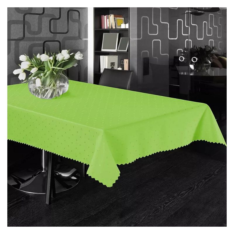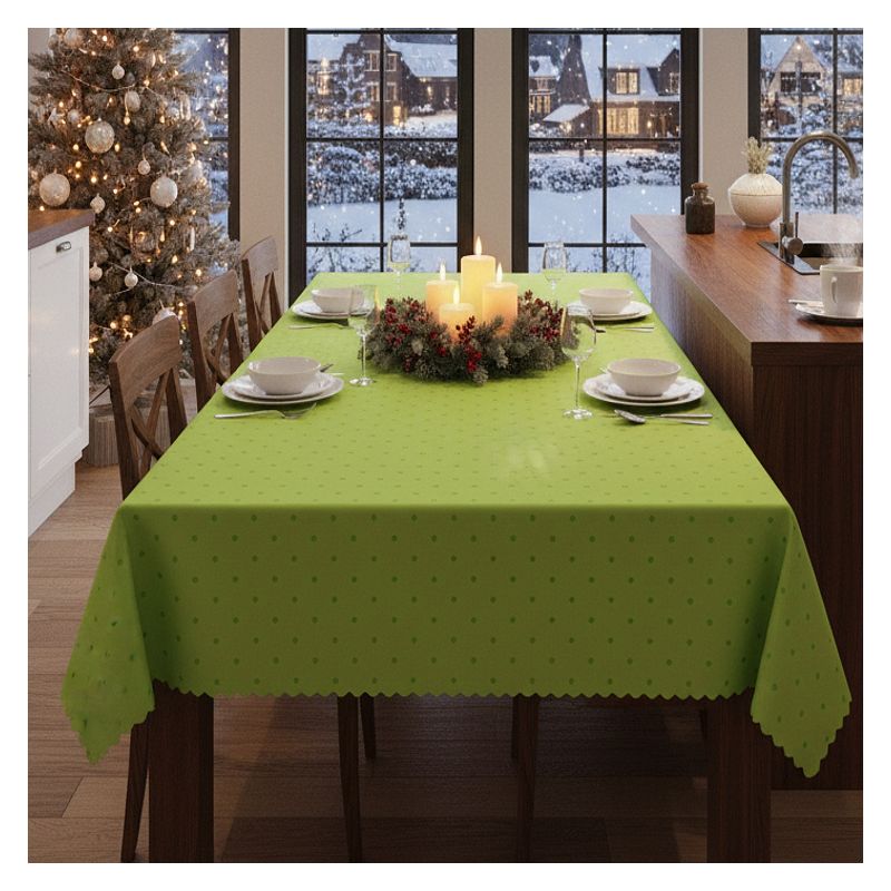 Prostokątny obrus z kropkami w seledynowej kolorystyce będzie modną ozdobą Twojego stołu przez wiele lat, stanowiąc przyjemny dla oka akcent dekoracyjny Twojego mieszkaniu lub domu.