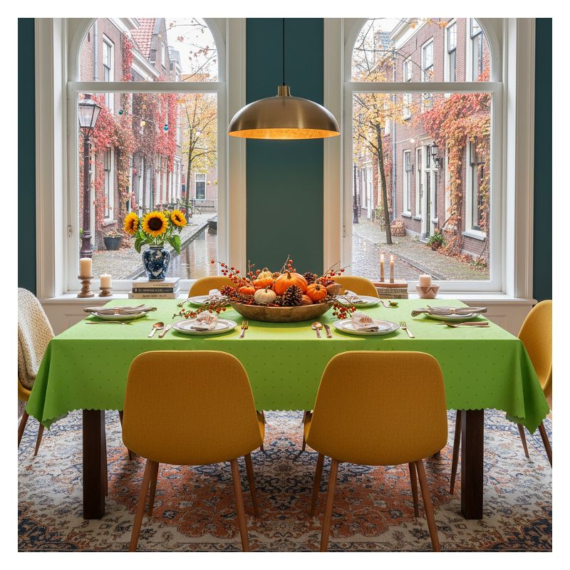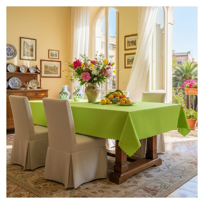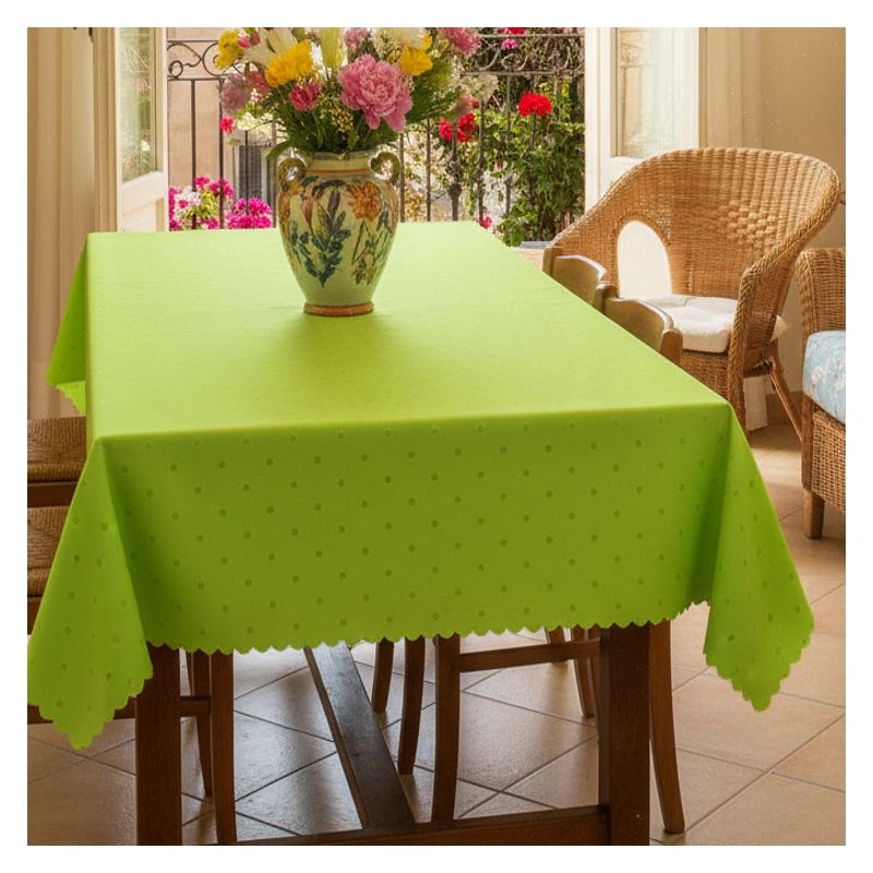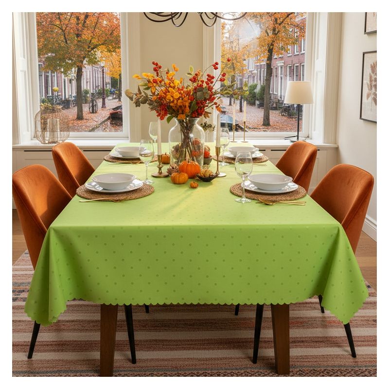 Ekstra duży prostokątny obrus z kropkami w kolorze seledynowym podkreśli nowoczesny design Twojego stołu - seledynowa dekoracja idealna jest zarówno na co dzień, jak i na specjalne, uroczyste okazje.