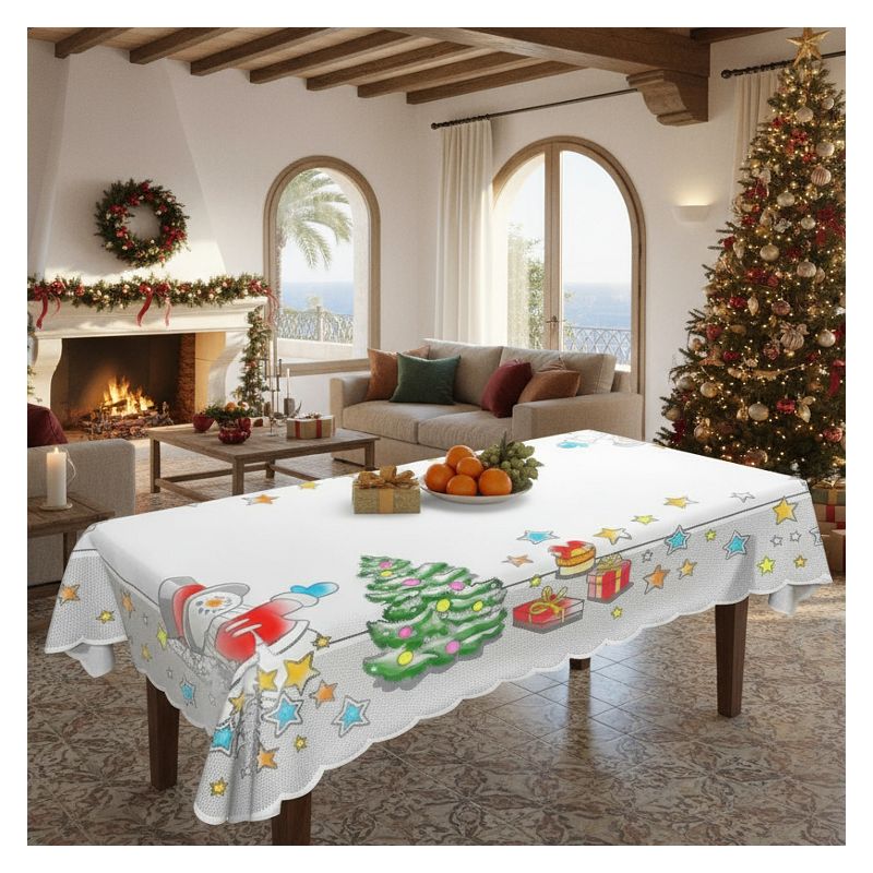 Tradycyjne, wielokolorowe bożonarodzeniowe detale zdobiące biały obrus wprowadzą do wnętrza Twojego domu wesoły, świąteczny nastrój w zimowej porze roku.