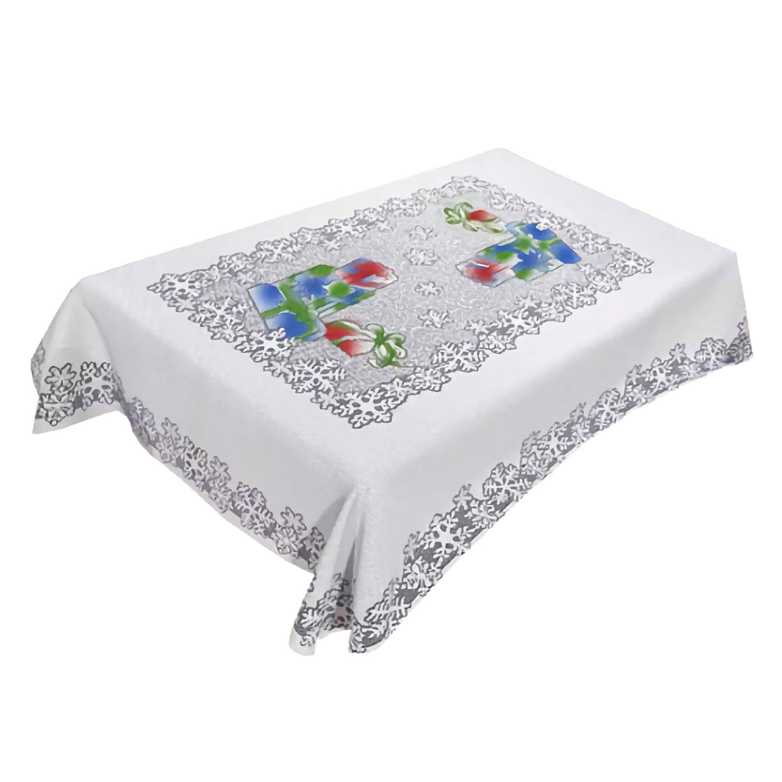Prostokątny obrus o wymiarach 110 x 130 cm doskonale nadaje się do udekorowania większości standardowych stołów podczas zimowych i bożonarodzeniowych spotkań.