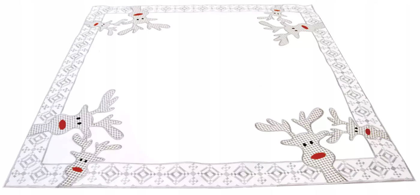 Obrus świąteczny na Boże Narodzenie z motywem reniferów o wymiarach 85x85 cm to idealna dekoracja na świąteczny stół. Obrus wykonany jest z wysokiej jakości materiału, który zapewnia trwałość i elegancki wygląd. Na obrzeżach obrusy znajdują się aplikacje reniferów w delikatnym wzorze w kratkę, które dodają uroku i świątecznej atmosfery. Renifery mają urocze czerwone noski i subtelne detale, co nadaje obrusowi wyjątkowego charakteru. Doskonale sprawdzi się zarówno w trakcie rodzinnych kolacji, jak i przy większych spotkaniach, dodając magii i ciepła świątecznym chwilom.