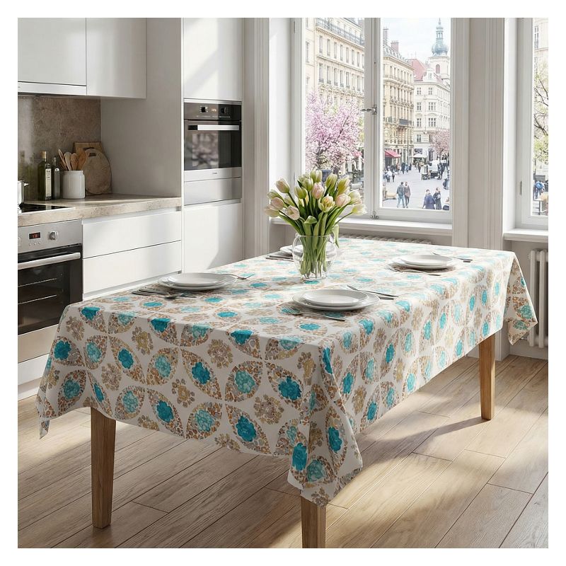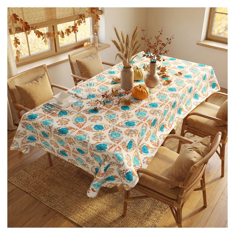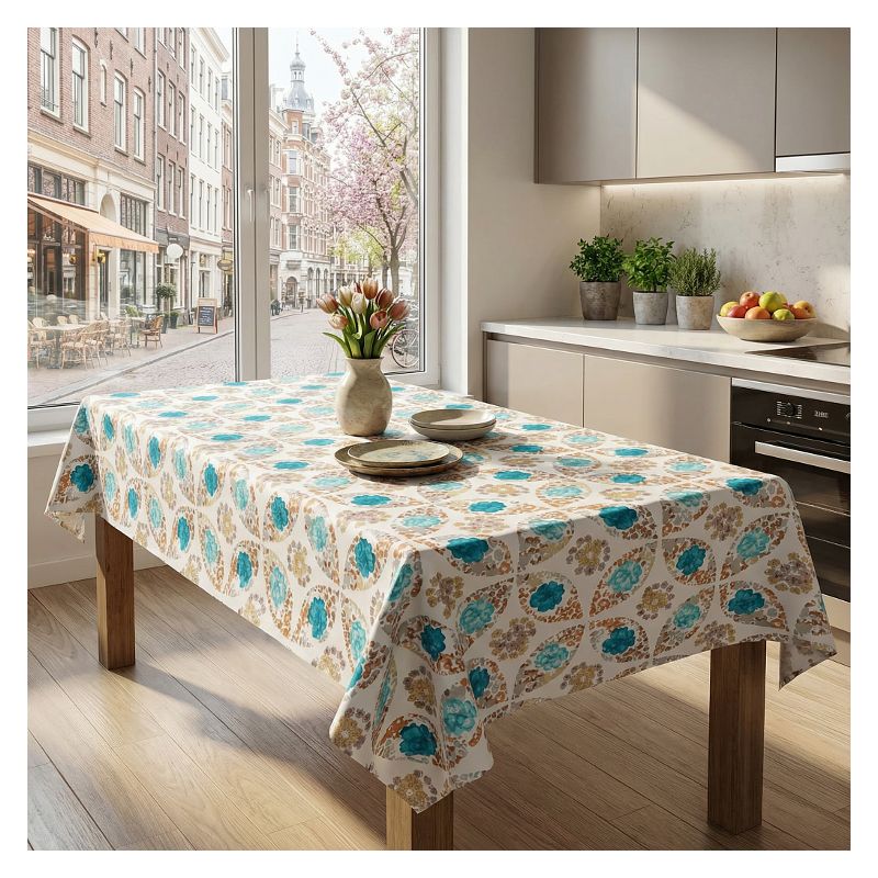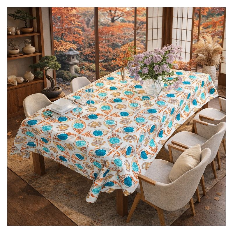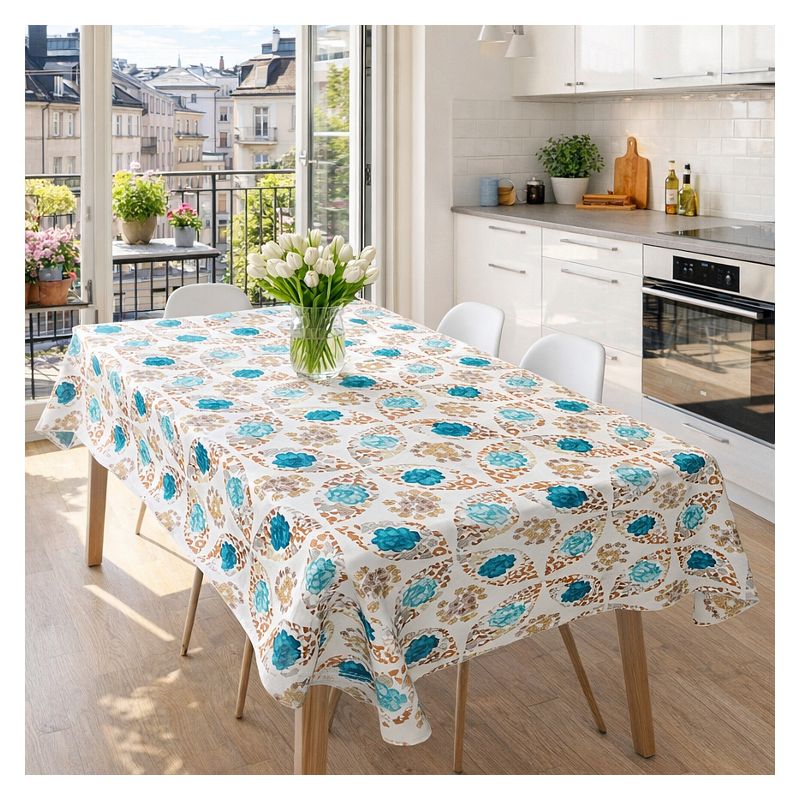 Nowoczesny obrus upiększony został wielokolorowym kwiatowym wzorem zdobniczym - kolor jest wyrazisty i trwały, a obrus zachowa swój wygląd nawet po wielokrotnym praniu.