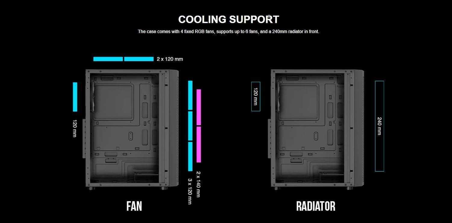 4x BUILT-IN FIXED RGB FANS: Podwozie do gier jest dobrze wyposażone w 4 wbudowane wentylatory RGB 120 mm wyświetlane w całości przez przedni panel siatki i hartowany szklany panel boczny