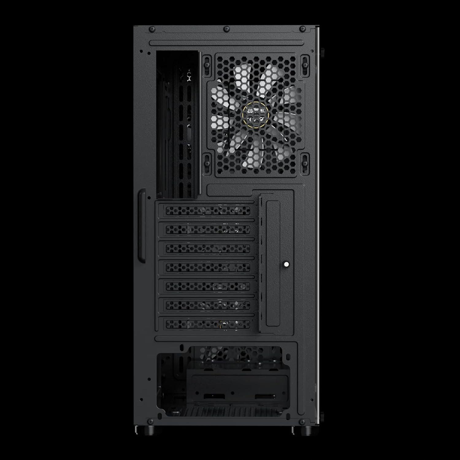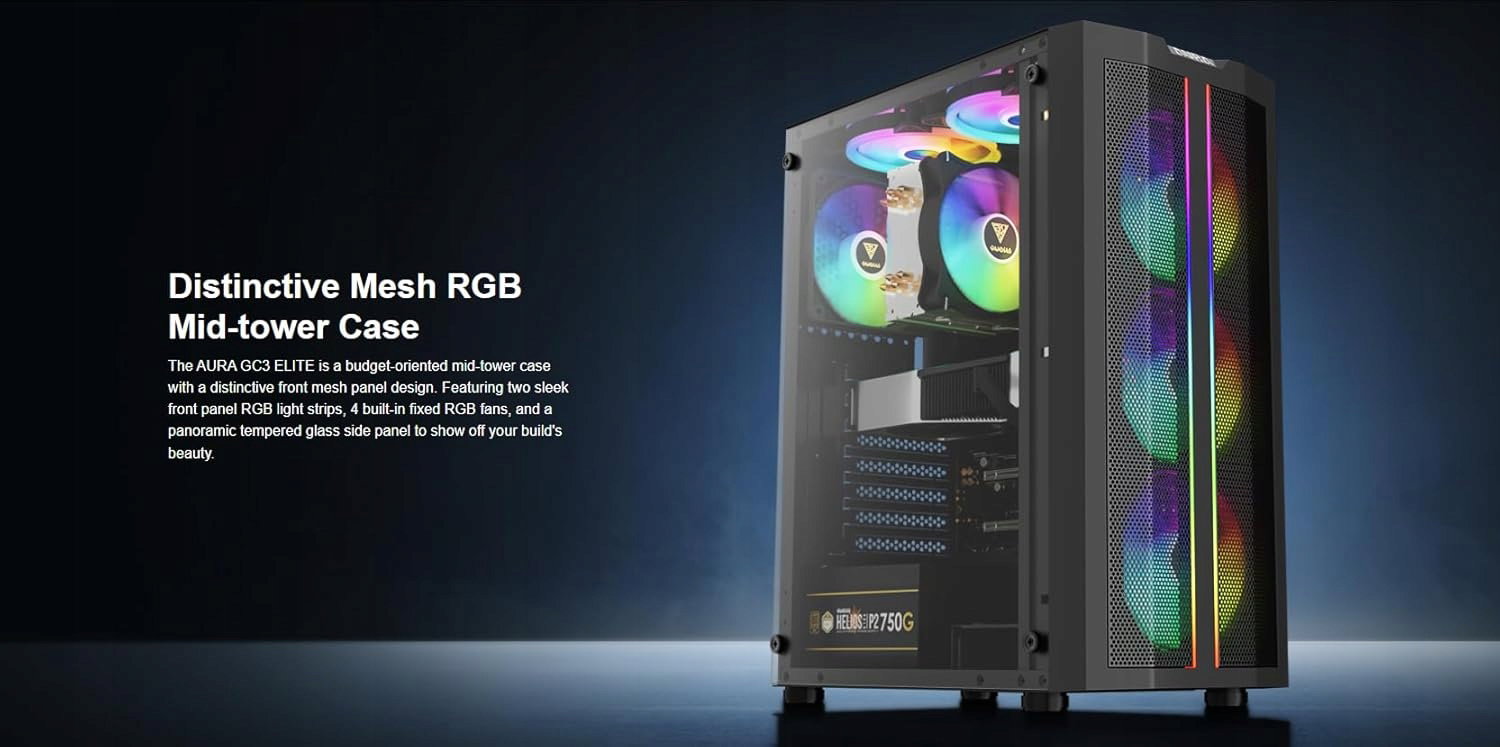 Wyraźna obudowa średniej wieży Mesh RGB AURA GC3 ELITE to obudowa z środkową wieżą o charakterystycznej konstrukcji panelu z przedniej siatki. Wyposażony w dwie eleganckie listwy świetlne RGB z panelem przednim, 4 wbudowane wentylatory RGB i panoramiczny szklany panel boczny, aby pokazać piękno swojej konstrukcji
