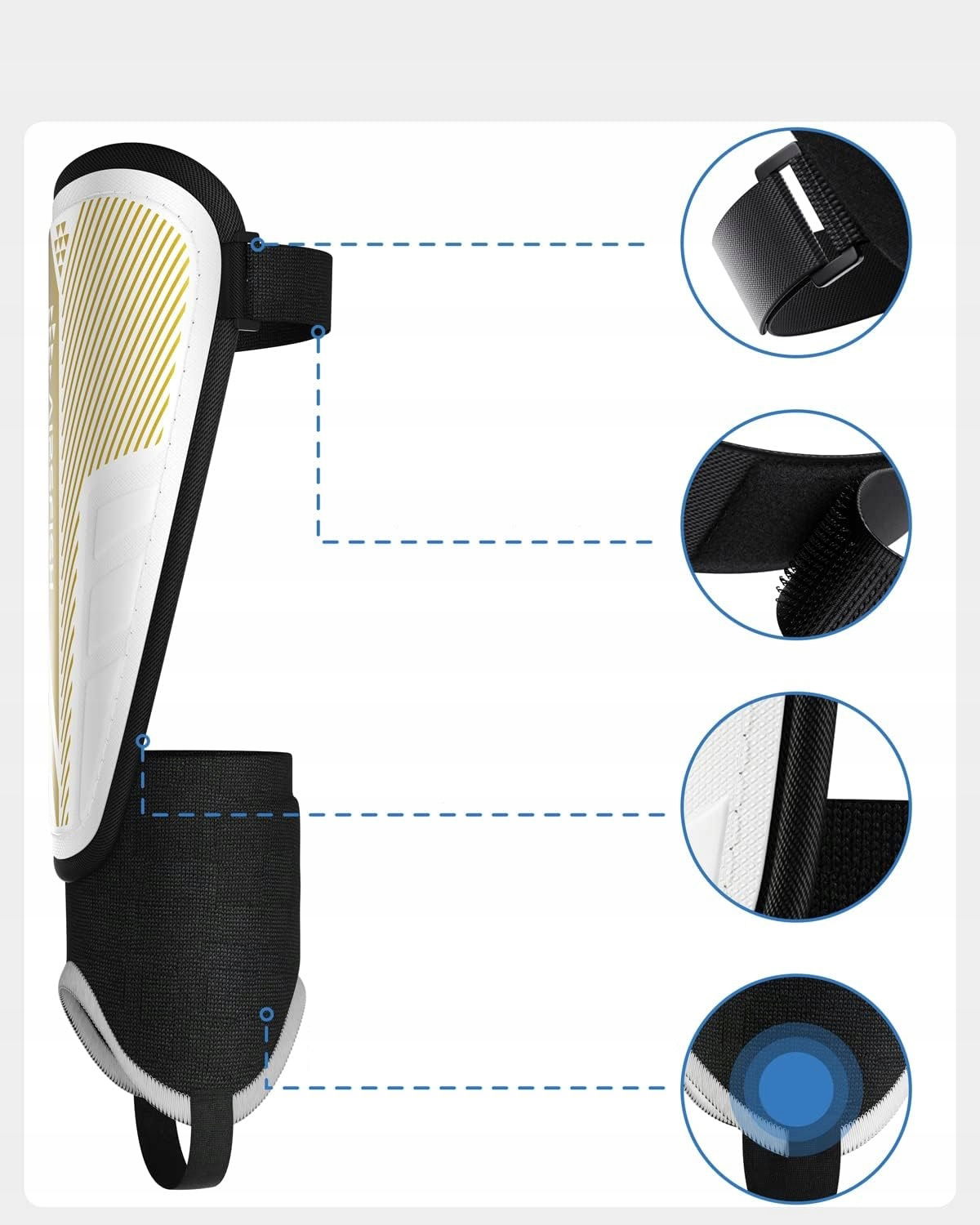 - Ponadto wprowadziliśmy zapięcia na rzepy dla większej stabilności, które zapewniają, że ochraniacze na piszczele są zawsze na swoim miejscu, zapobiegają ślizganiu się we wszystkich kierunkach i zapewniają lepszą ochronę nawet po dłuższym użytkowaniu.