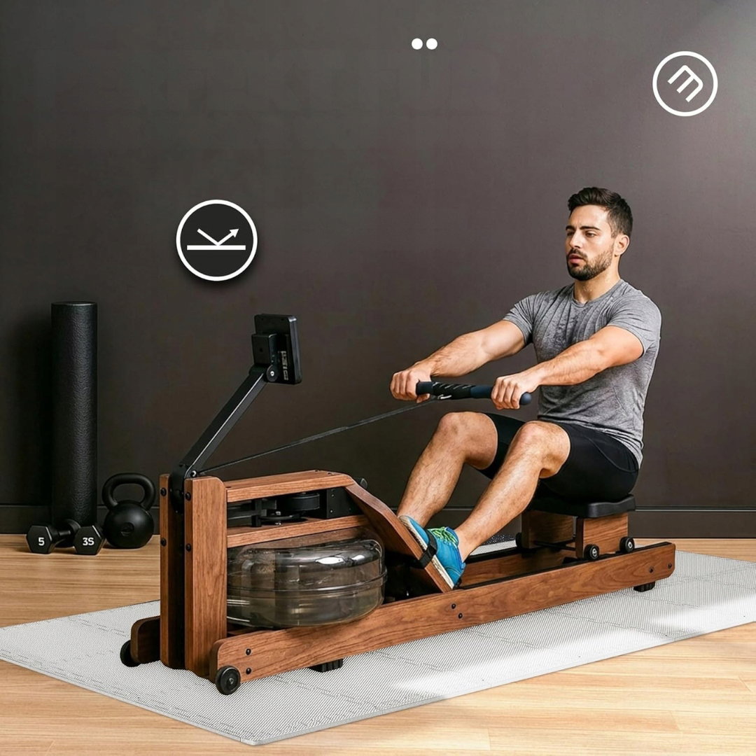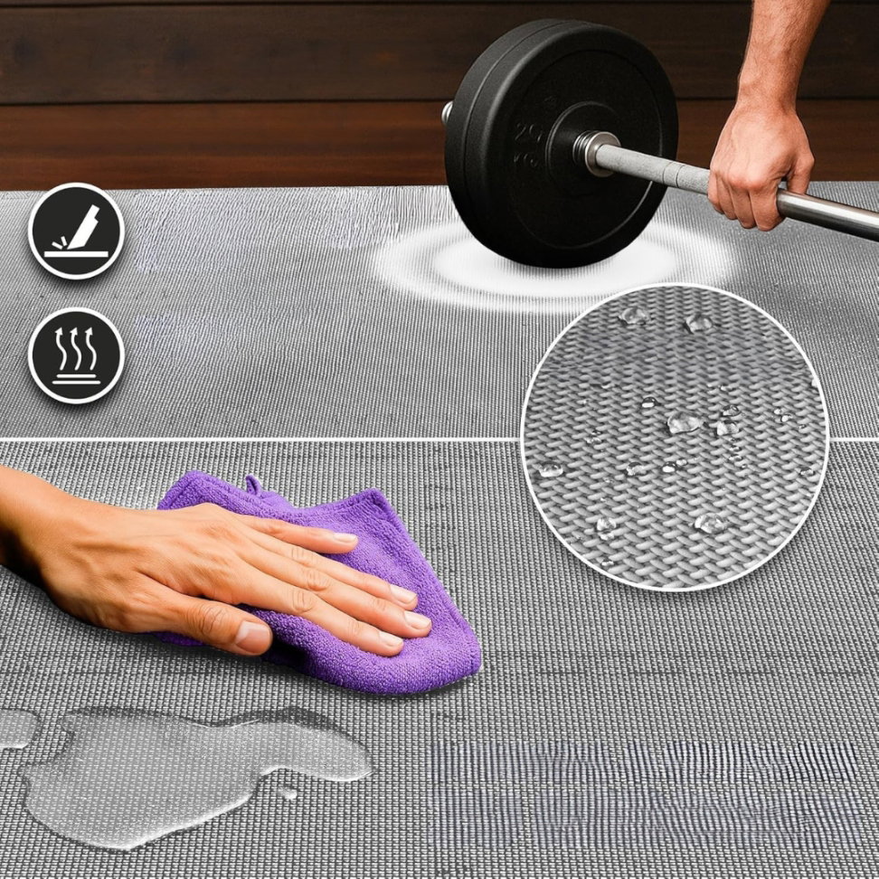 - Ochrona podłogi: zestaw chroni podłogę przed zarysowaniami, wgnieceniami i zabrudzeniami spowodowanymi użytkowaniem sprzętu. Wykonane z lekkiego materiału premium, maty działają amortyzująco, tłumią dźwięki, izolują ciepło i są wodoodporne.